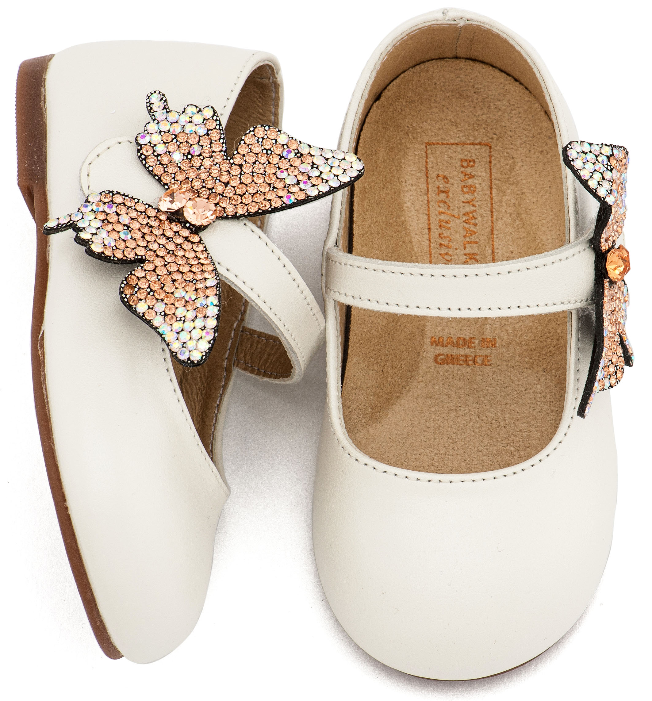 Δερμάτινο Γοβάκι με Στρασένια Πεταλούδα στο Πλάι σε Εκρού Χρώμα