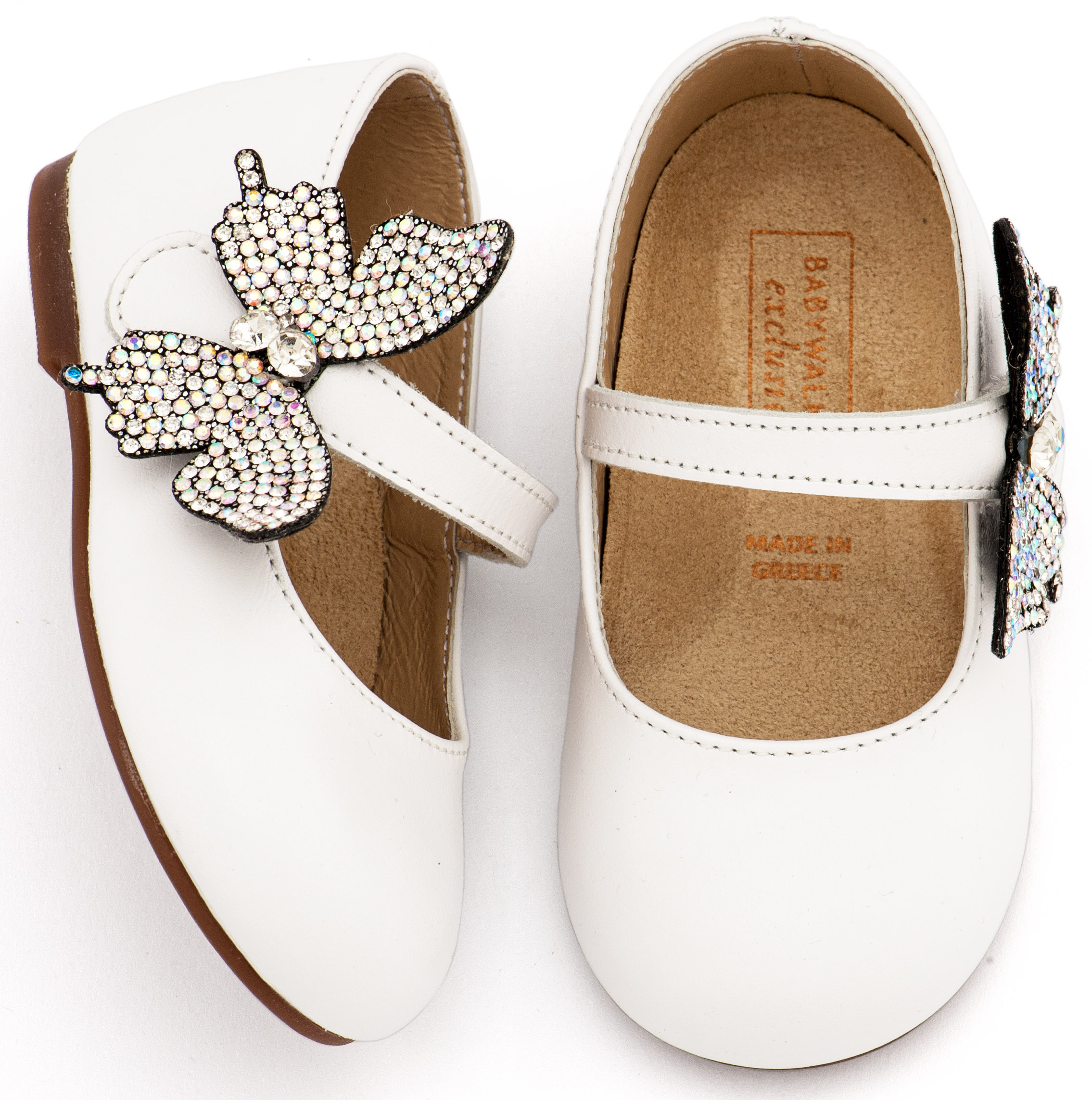 Δερμάτινο Γοβάκι με Στρασένια Πεταλούδα στο Πλάι σε Λευκό Χρώμα