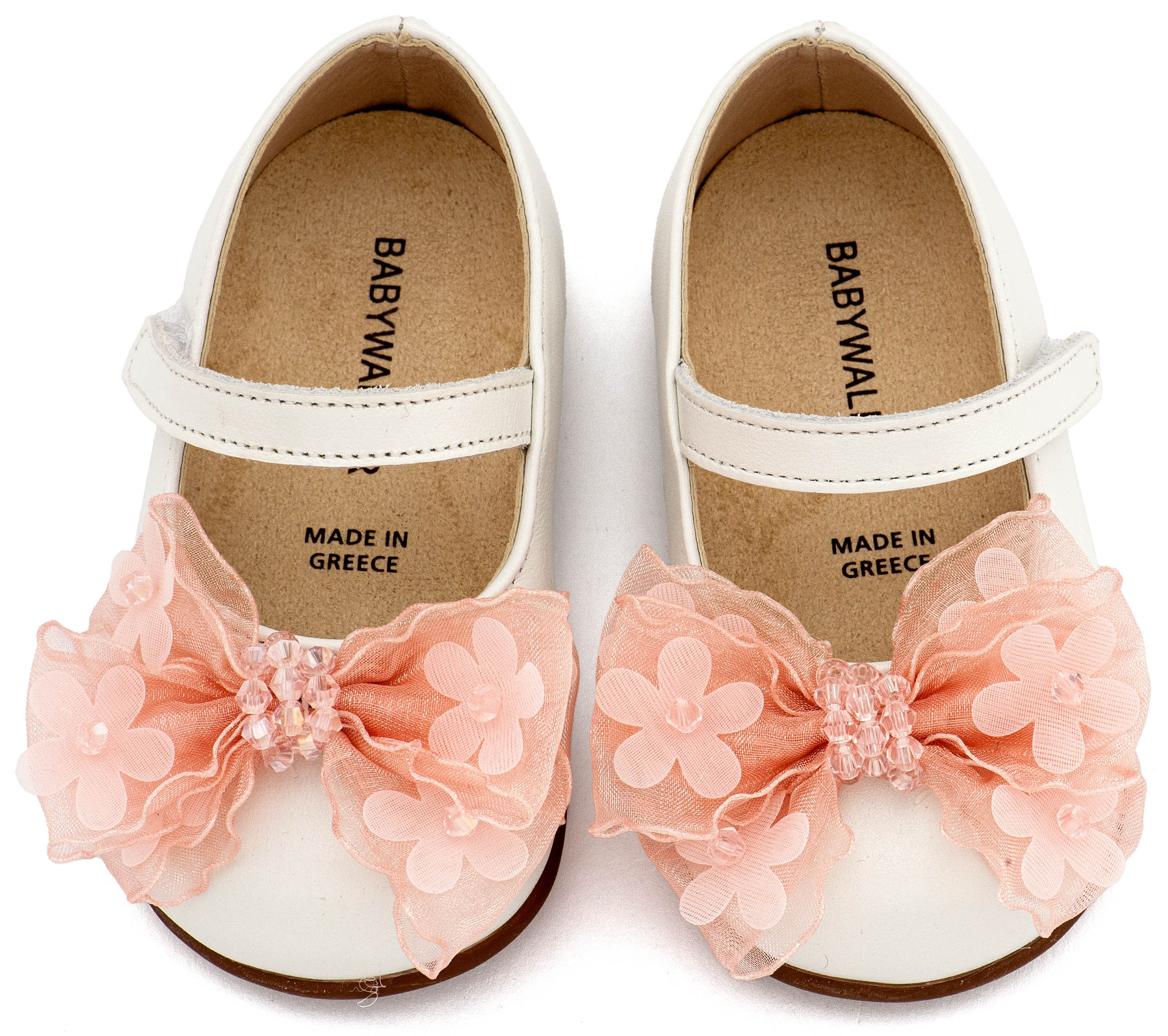 Δερμάτινο Γοβάκι Μονή Μπαρέτα Φιογκάκι Οργάντζας σε Εκρού Ροζ Χρώμα
