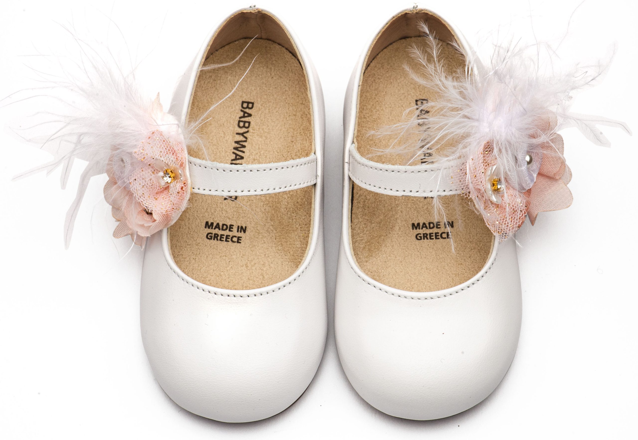 Δερμάτινο Γοβάκι Μονή Μπαρέτα με Χειροποίητο Διακοσμητικό από Λουλούδια και Πούπουλα σε Λευκό Ροζ Χρώμα
