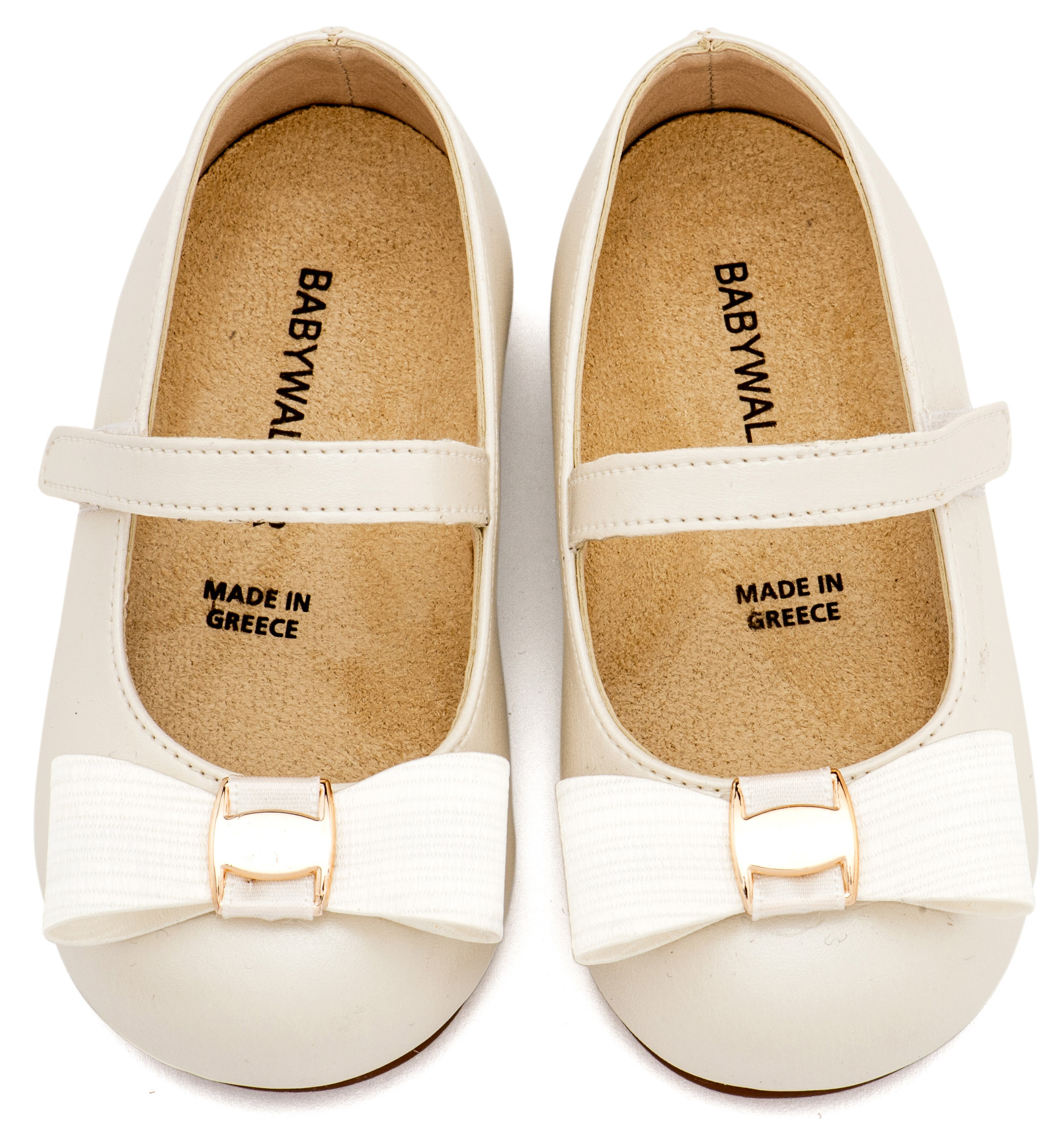 Δερμάτινο Γοβάκι Μονή Μπαρέτα με Σατέν Φιόγκο και Χρυσή Αγκράφα σε Εκρού Χρώμα