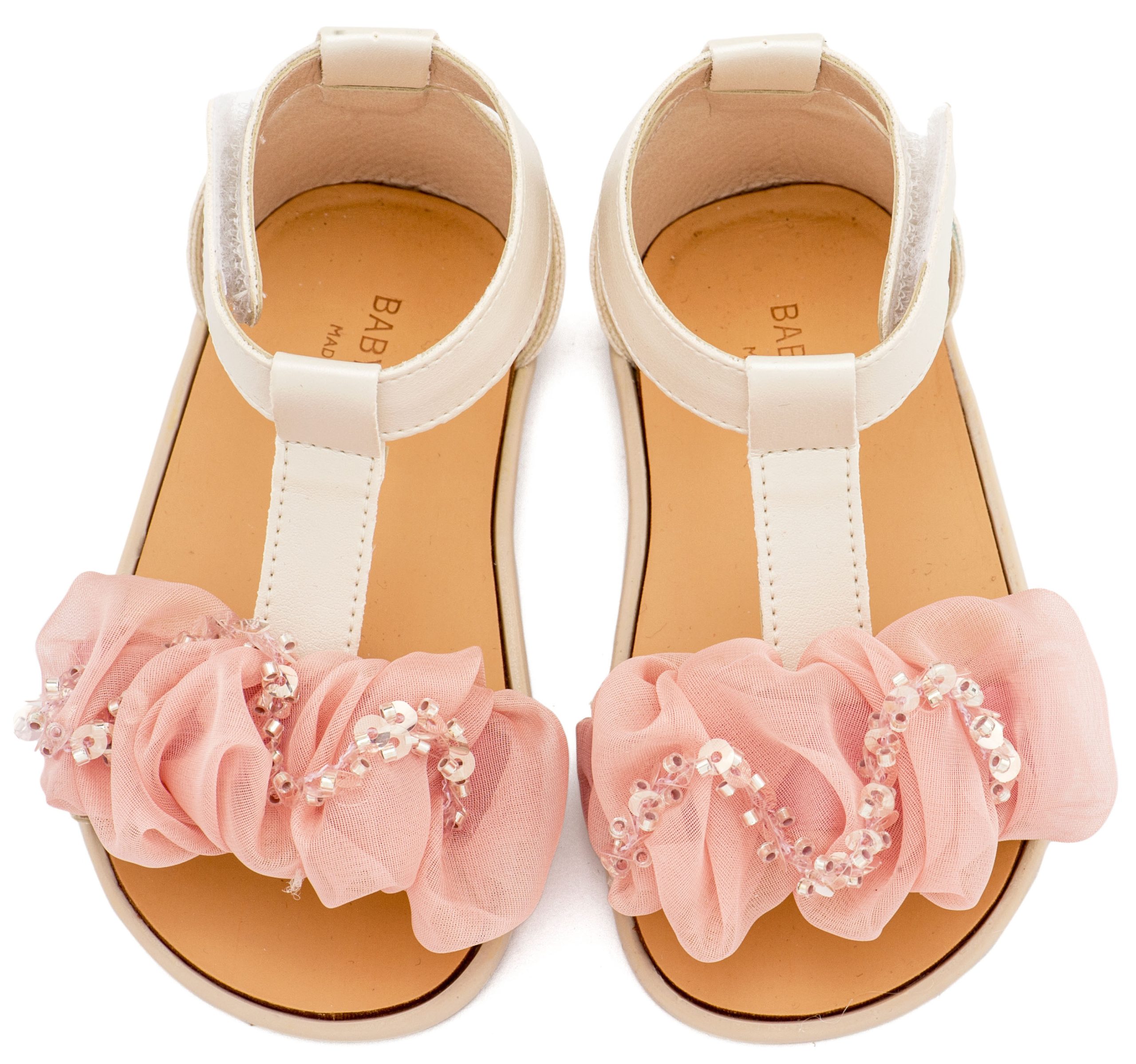 Δερμάτινο Πέδιλο Διακοσμημένο με Χειροποίητο Διακοσμητικό Οργάντζας και Παγιέττες σε Εκρού Ροζ Χρώμα