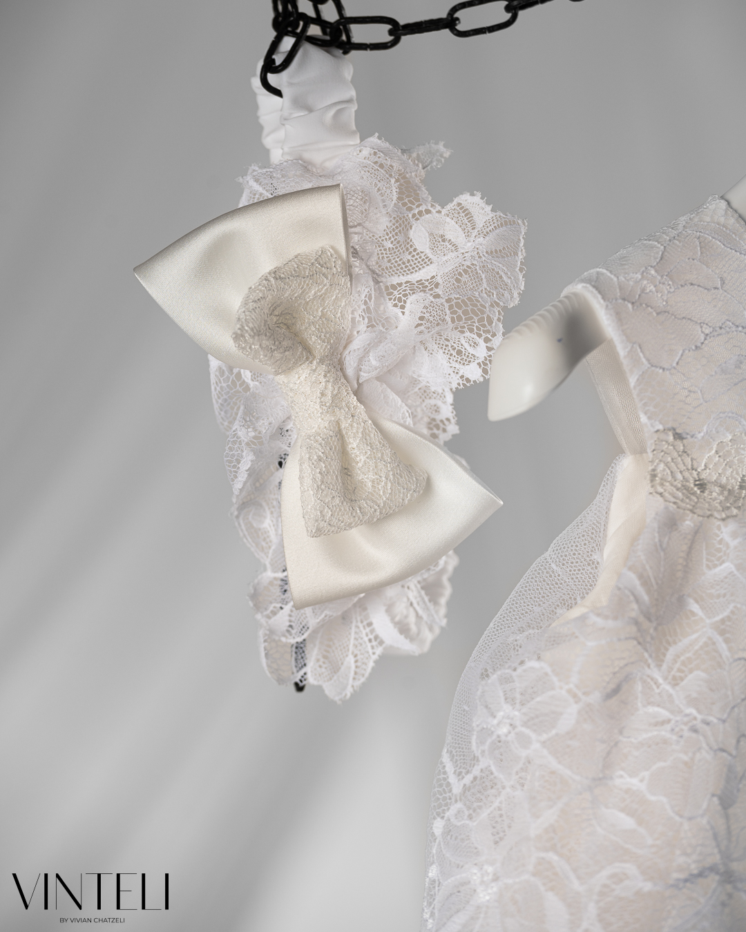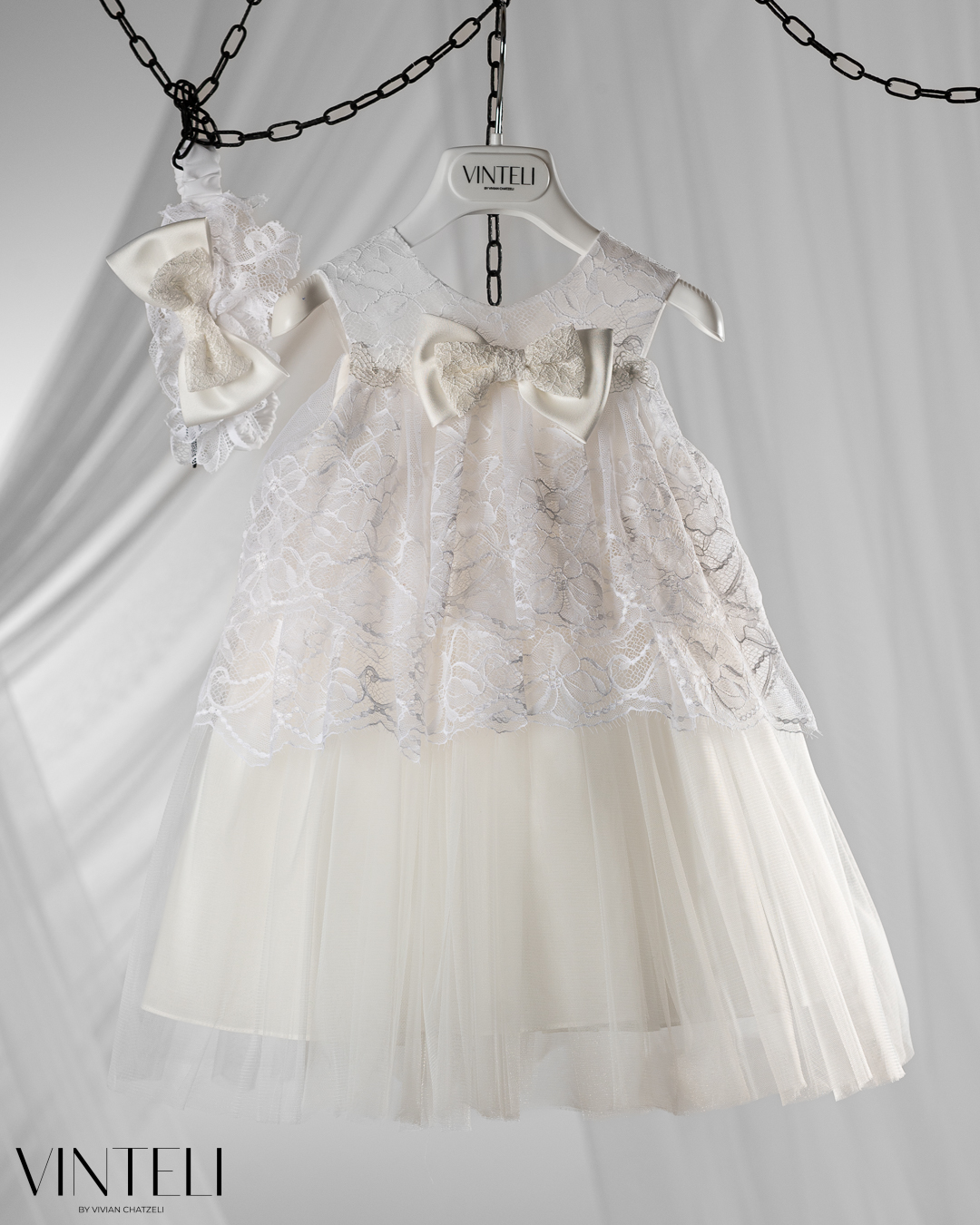 Βαπτιστικό φόρεμα με ρομαντικό και κομψό χαρακτήρα. Το επάνω μέρος διακοσμείται με δαντέλα, χαρίζοντας ένα ιδιαίτερο και ξεχωριστό αποτέλεσμα, ενώ ο μικρός φιόγκος στο μπροστινό μέρος προσθέτει μια διακριτική και γλυκιά λεπτομέρεια. Η φούστα από τούλι ανοίγει απαλά, δημιουργώντας όμορφη κίνηση και ανάλαφρη αίσθηση. Ο συνδυασμός των υφών δίνει ένα κομψό και ισορροπημένο σύνολο. Συνοδεύεται από ασορτί κορδέλα μαλλιών, ολοκληρώνοντας αρμονικά την εμφάνιση.