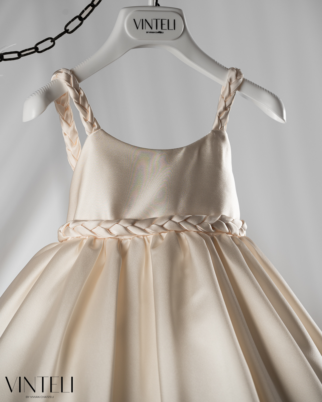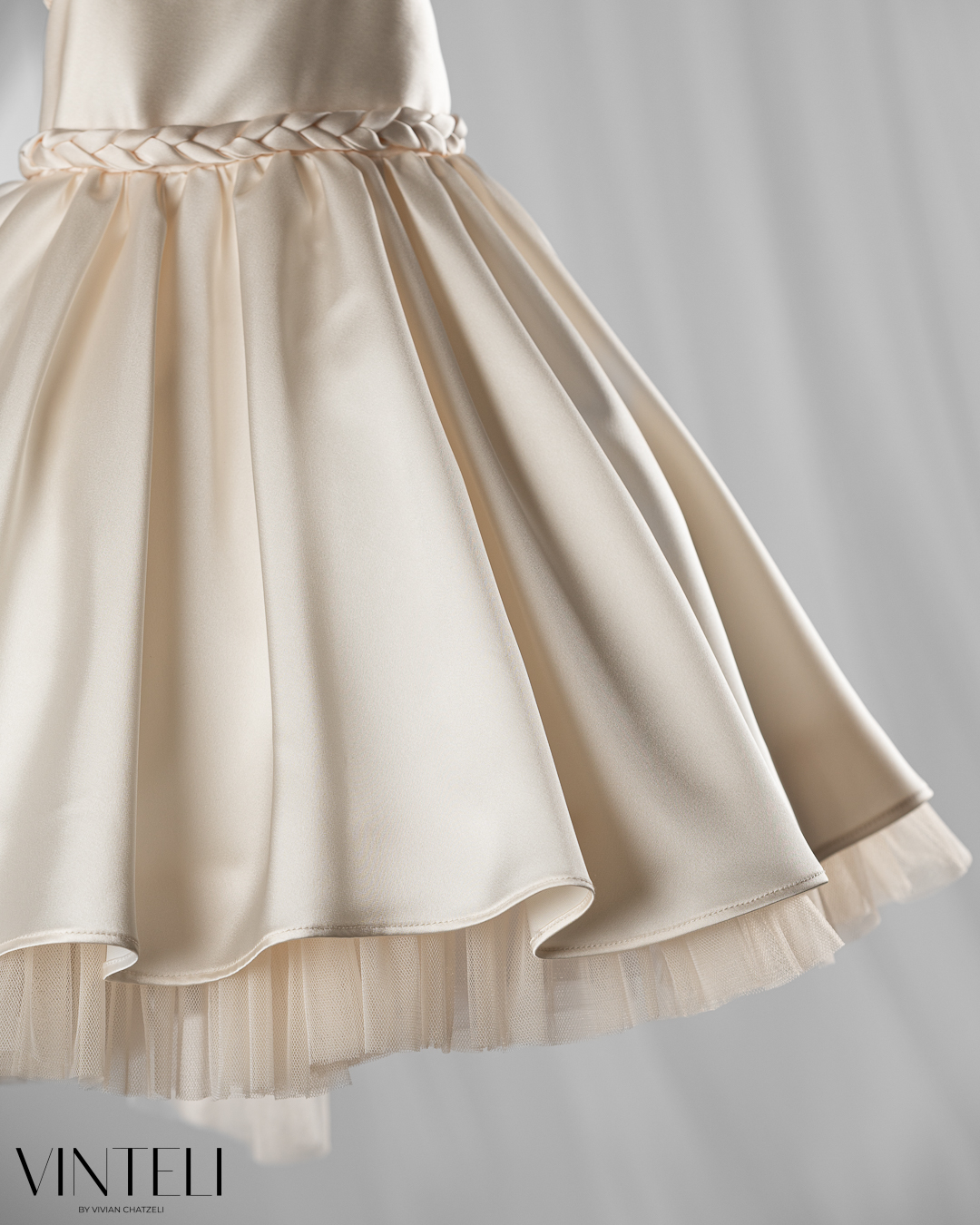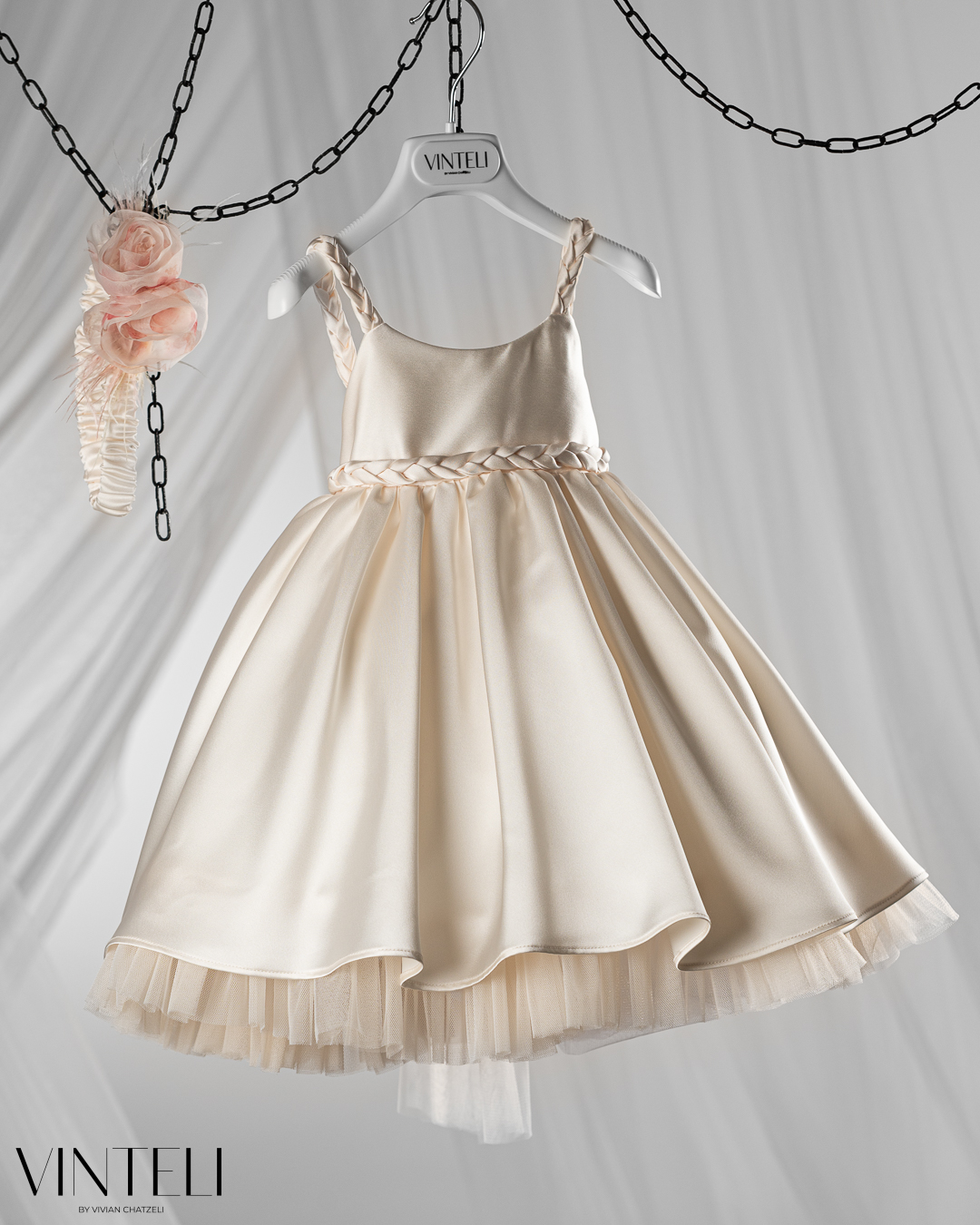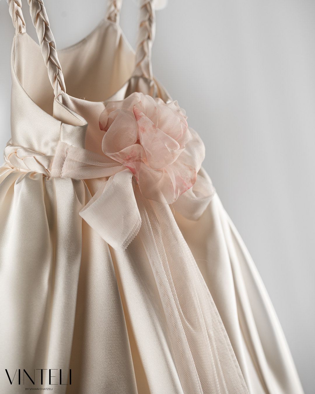 Βαπτιστικό φόρεμα σε απαλό εκρού τόνο, από σατέν ύφασμα που χαρίζει διακριτική λάμψη και κομψή εμφάνιση. Η φούστα ανοίγει πλούσια με όμορφη κίνηση, ενώ στο τελείωμα διακρίνεται τούλι που προσθέτει όγκο και μια αέρινη αίσθηση. Το μπούστο είναι λιτό και καλαίσθητο, με τιράντες που δένουν απαλά στους ώμους, ενώ στη μέση ξεχωρίζει πλεξούδα από το ίδιο ύφασμα, δημιουργώντας μια ιδιαίτερη και αρμονική λεπτομέρεια. Στο πίσω μέρος διαθέτει διακοσμητικό λουλούδι με παραμάνα, ώστε να μπορεί να τοποθετηθεί όπου επιθυμείτε, προσφέροντας ευελιξία και μια ξεχωριστή πινελιά στο σύνολο. Συνοδεύεται από ασορτί κορδέλα μαλλιών, ολοκληρώνοντας όμορφα την εμφάνιση. Μια κομψή και διαχρονική επιλογή για βάπτιση, ιδανική για ιδιαίτερες στιγμές.