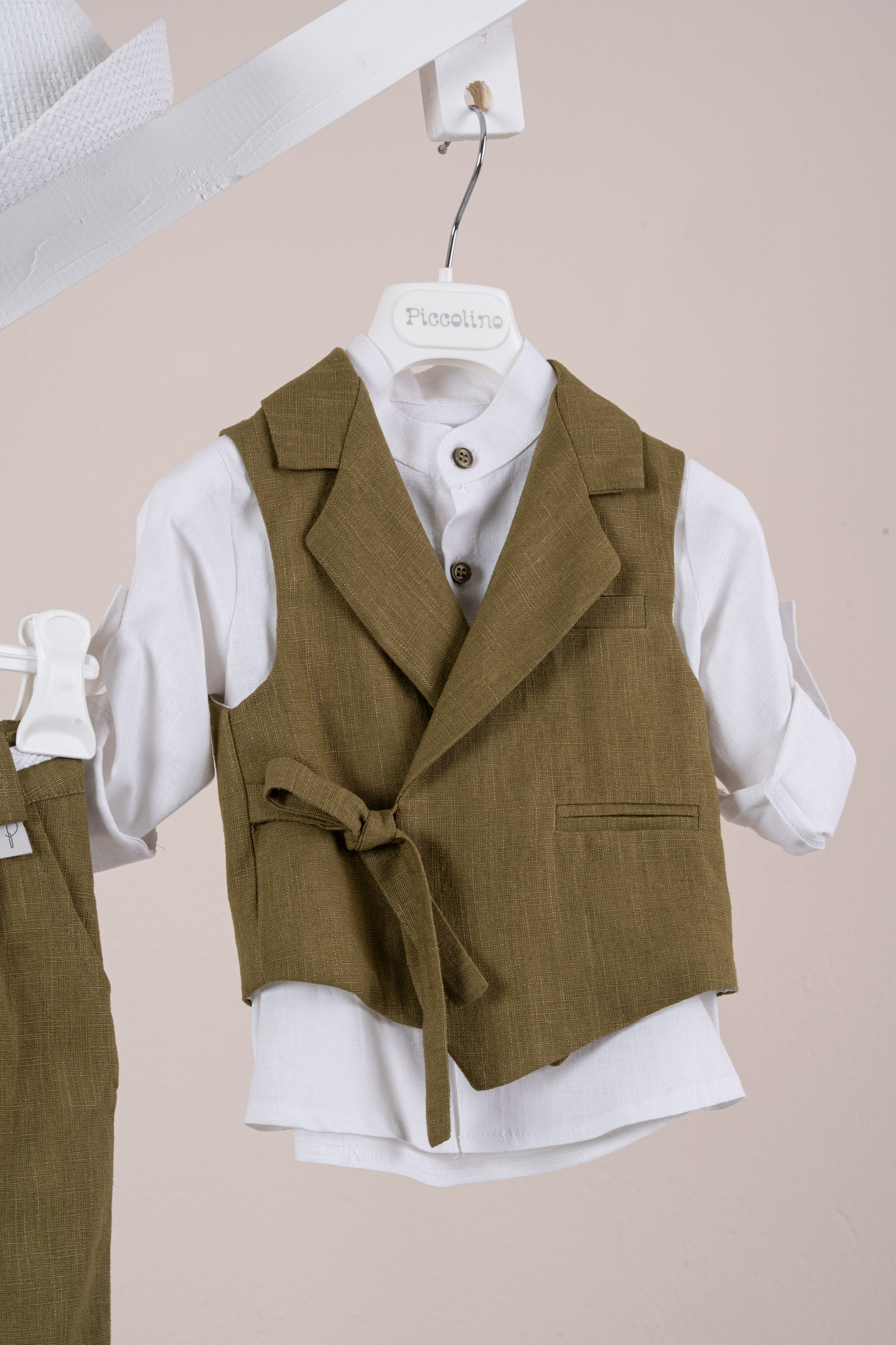 Βαπτιστικό κοστούμι Piccolino Fabio σε χρώμα Golden Olive. Περιλαμβάνει λινό γιλέκο με δέσιμο στο πλάι, πουκάμισο λινό με μάο γιακά, παντελόνι λινό με πιέτες σε χρώμα Golden Olive, ζωνάκι με double D δέσιμο και καπέλο με φάσα. Διαθέσιμο σε 4 μεγέθη 6-12, 12-18, 18-24, 24-36(εξτρά χρέωση)