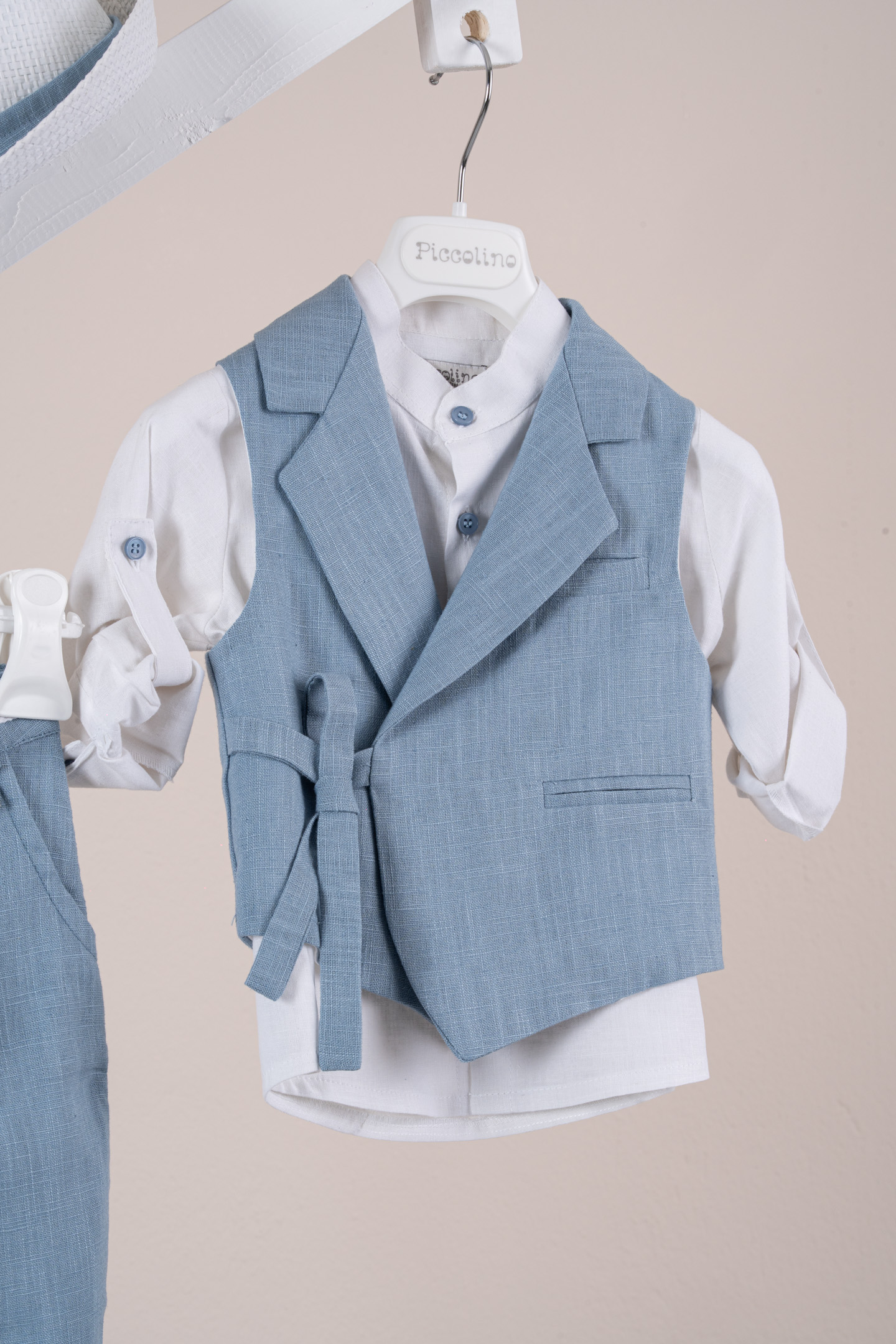 Βαπτιστικό κοστούμι Piccolino Fabio σε χρώμα Raf. Περιλαμβάνει λινό γιλέκο με δέσιμο στο πλάι, πουκάμισο λινό με μάο γιακά, παντελόνι λινό με πιέτες σε χρώμα Raf, ζωνάκι με double D δέσιμο και καπέλο με φάσα. Διαθέσιμο σε 4 μεγέθη 6-12, 12-18, 18-24, 24-36(εξτρά χρέωση)