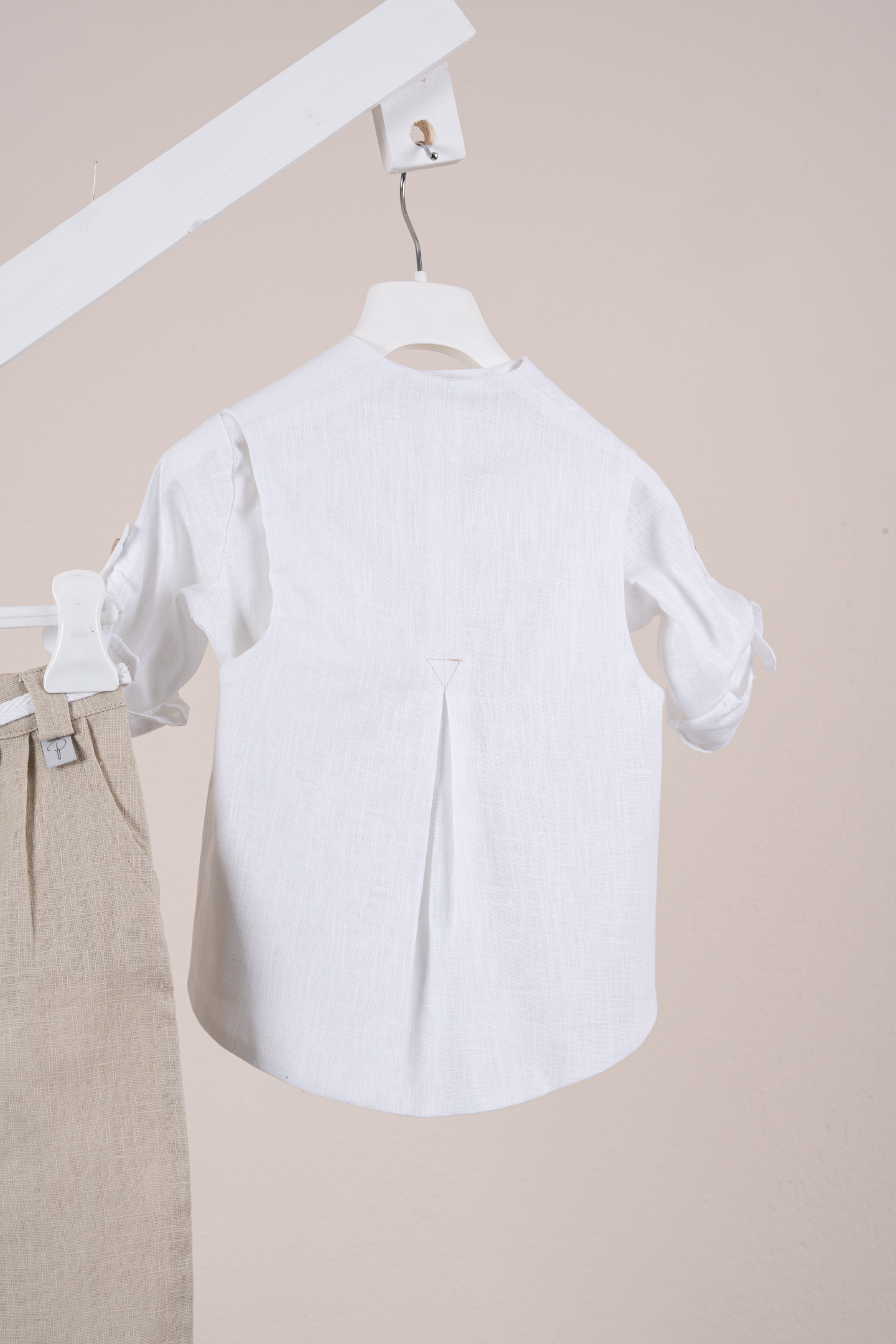 Βαπτιστικό κοστούμι Piccolino Hector σε χρώμα Beige. Περιλαμβάνει καμπυλόγραμμο λινό γιλέκο με κουφόπιετα στην πίσω πλευρά , λινή πουκαμίσα, παντελόνι λινό με πιέτες σε χρώμα Beige και ζωνάκι με double D δέσιμο και καπέλο με φάσα. Διαθέσιμο σε 4 μεγέθη 6-12, 12-18, 18-24, 24-36(εξτρά χρέωση)