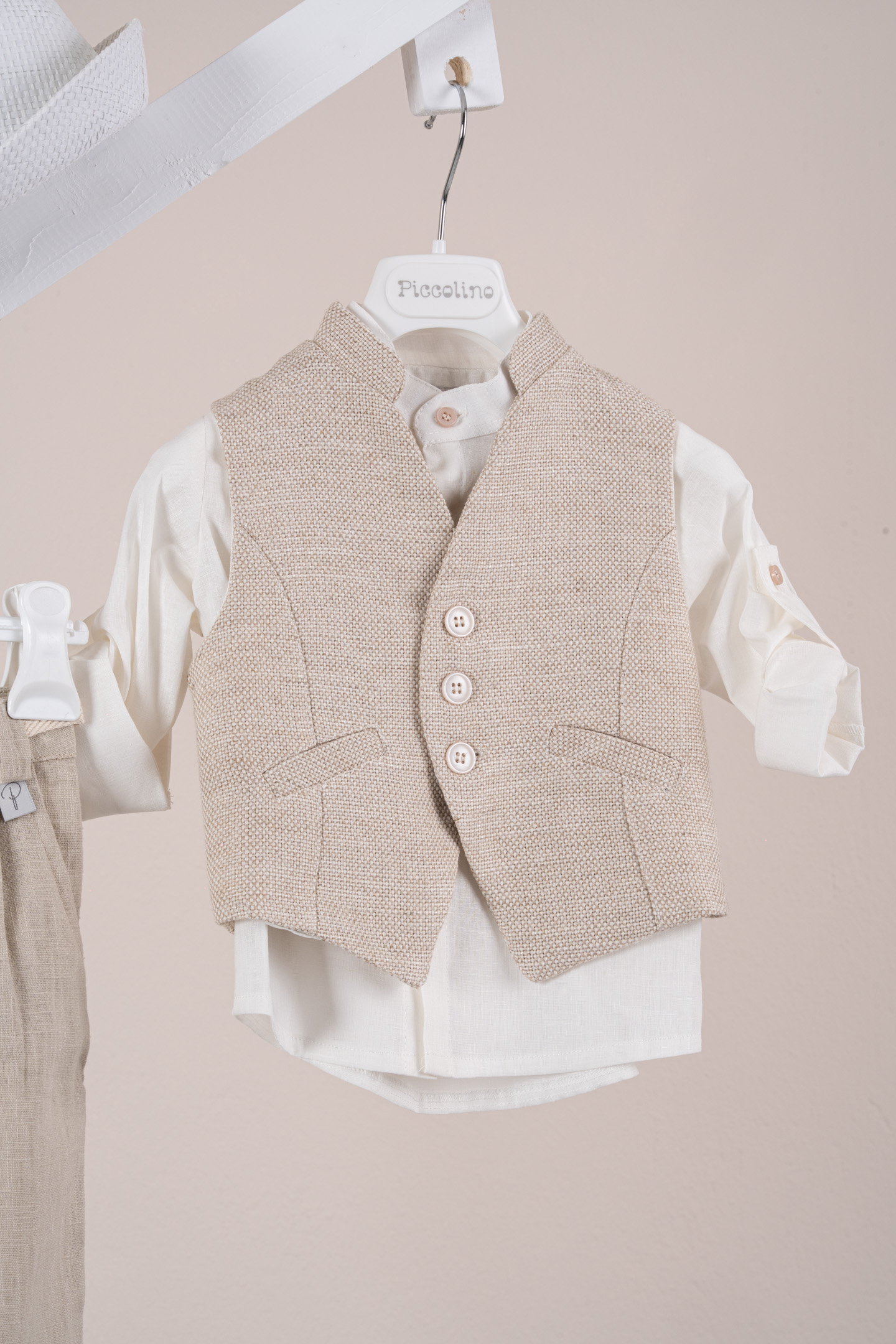 Βαπτιστικό κοστούμι Piccolino Logan σε χρώμα Beige. Περιλαμβάνει καμπυλόγραμμο βαμβακερό γιλέκο , πουκάμισο λινό με γιακά μάο, παντελόνι λινό με πιέτες σε χρώμα Beige, ζωνάκι με double D δέσιμο και καπέλο με φάσα. Διαθέσιμο σε 4 μεγέθη 6-12, 12-18, 18-24, 24-36(εξτρά χρέωση)