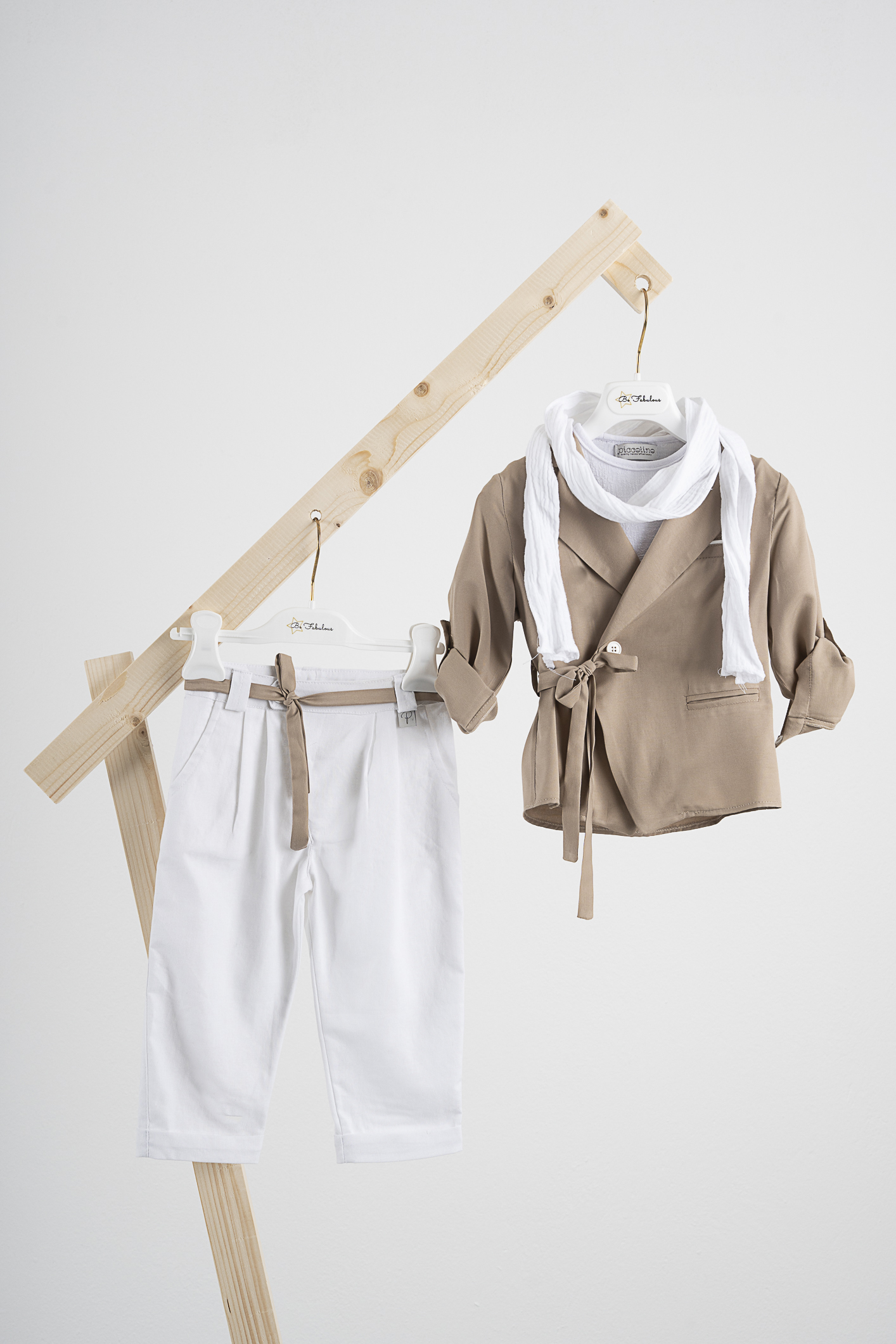 Κοστούμι Piccolino Stefan σε χρώμα Mocha. Περιλαμβάνει βισκόζη πουκαμίσα με δέσιμο με ζωνάκι, βαμβακερό λευκό μπλουζάκι, παντελόνι λινό με πιέτες λευκό, ζωνάκι και φουλάρι. Διαθέσιμο σε 4 μεγέθη 6-12, 12-18, 18-24, 24-36(εξτρά χρέωση)