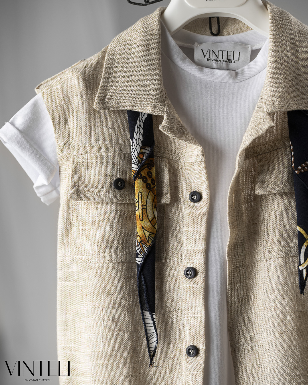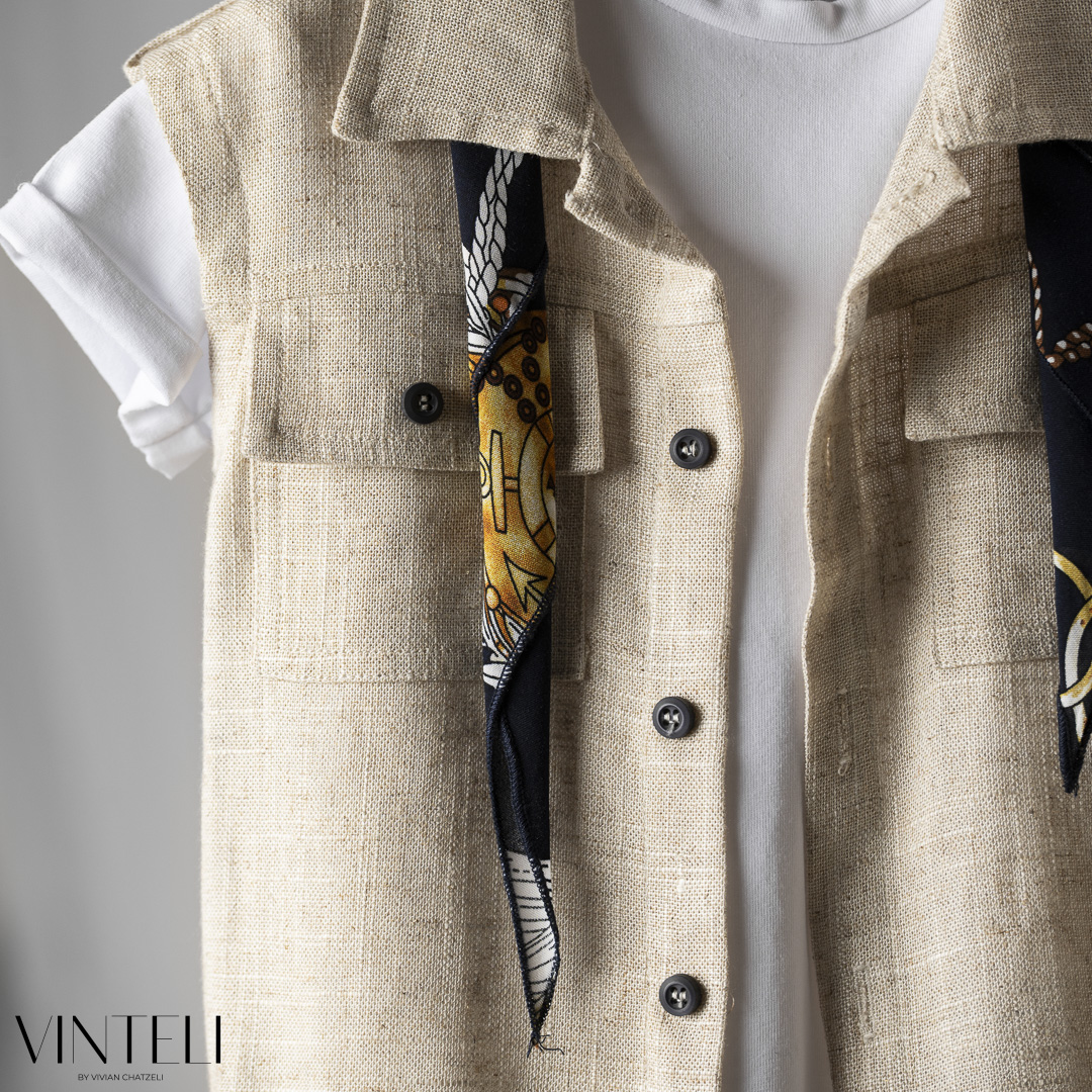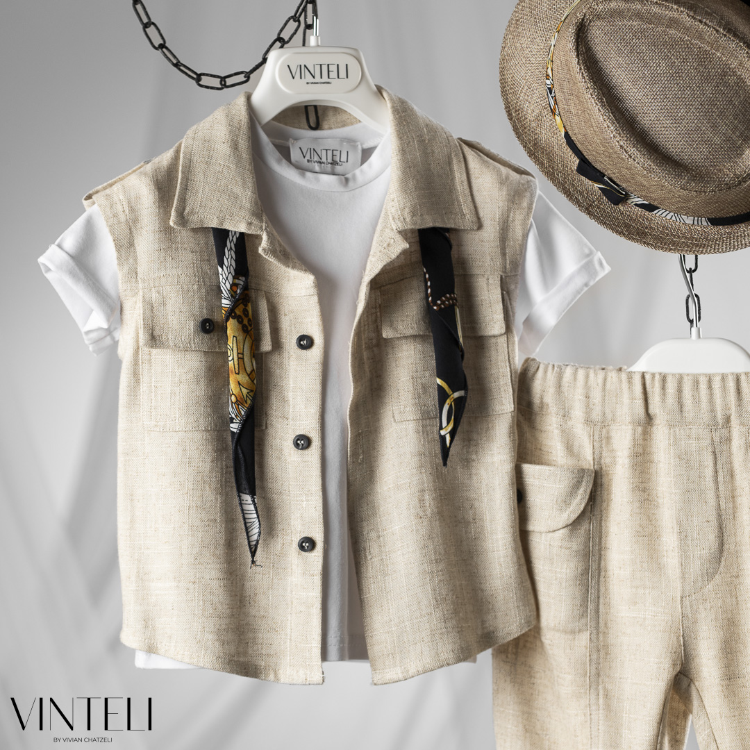 Ένα ανάλαφρο σύνολο με φυσική κομψότητα. Το t-shirt συνδυάζεται με γιλέκο με κουμπιά και τσέπες, ενώ το παντελόνι στην ίδια μπεζ απόχρωση δημιουργεί ένα ενιαίο και ισορροπημένο αποτέλεσμα. Το φουλάρι προσθέτει μία ιδιαίτερη πινελιά στο σύνολο, ενώ το καπέλο ολοκληρώνει την εμφάνιση με φυσικό χαρακτήρα.