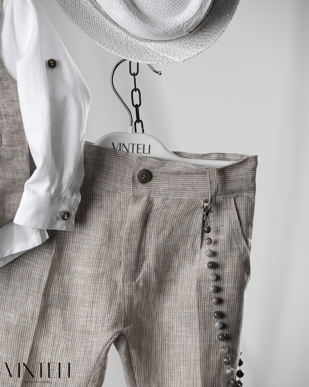 Ένα σύνολο με πιο επίσημο χαρακτήρα, που συνδυάζει κομψότητα και σύγχρονη αισθητική. Το γιλέκο με τις καθαρές γραμμές και το παντελόνι με τις πιέτες δημιουργούν μία προσεγμένη σιλουέτα, ενώ η λεπτομέρεια της αλυσίδας προσθέτει μία μοντέρνα νότα. Το παπιγιόν και το μαντηλάκι αναδεικνύουν το σύνολο, ενώ το καπέλο ολοκληρώνει την εμφάνιση με στυλ.