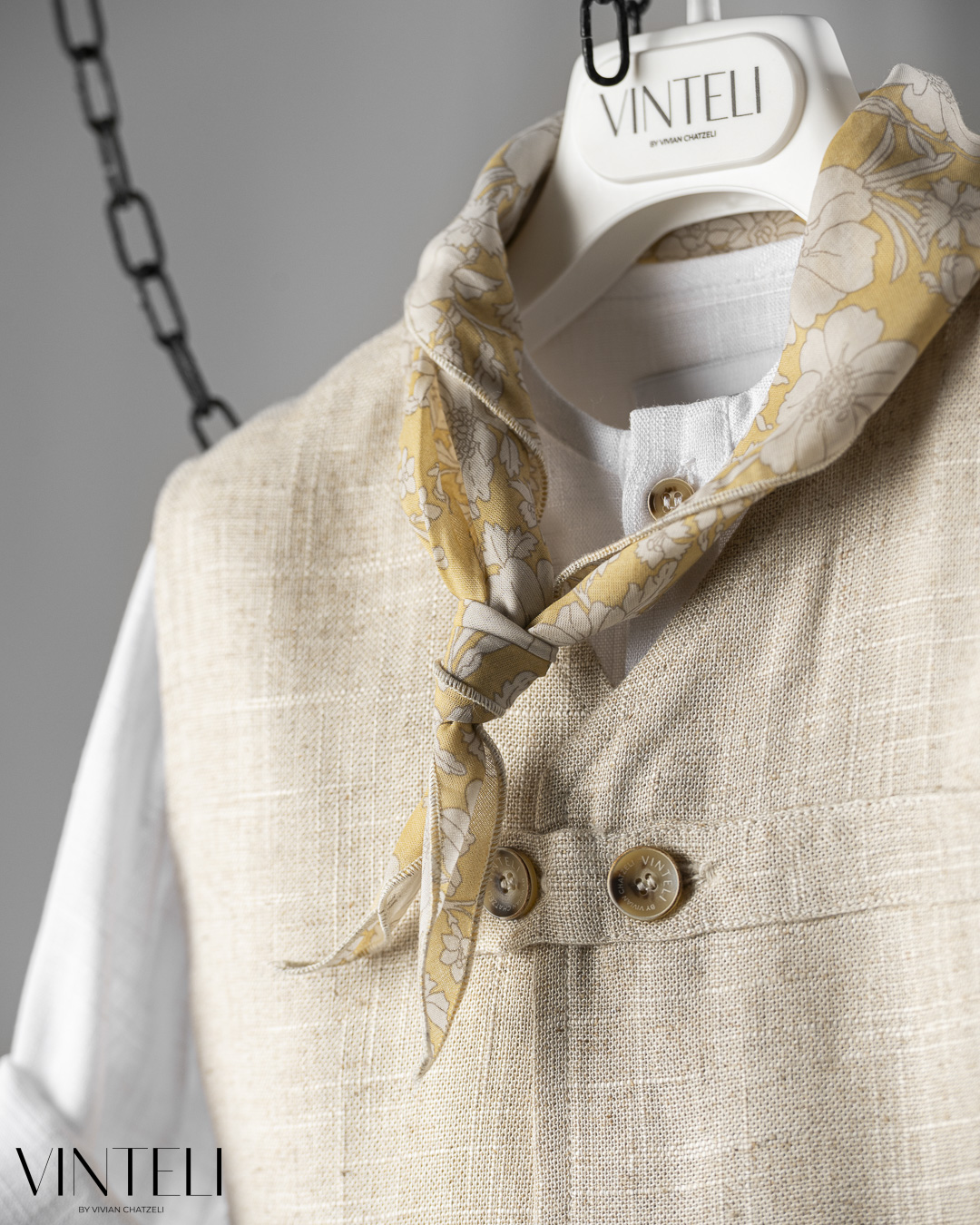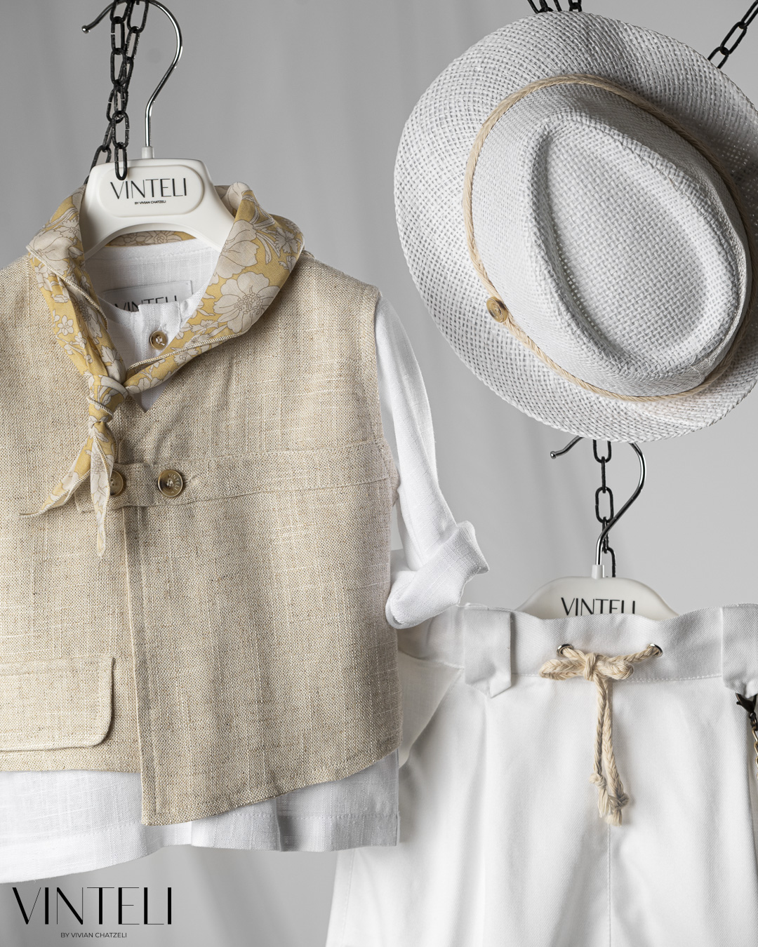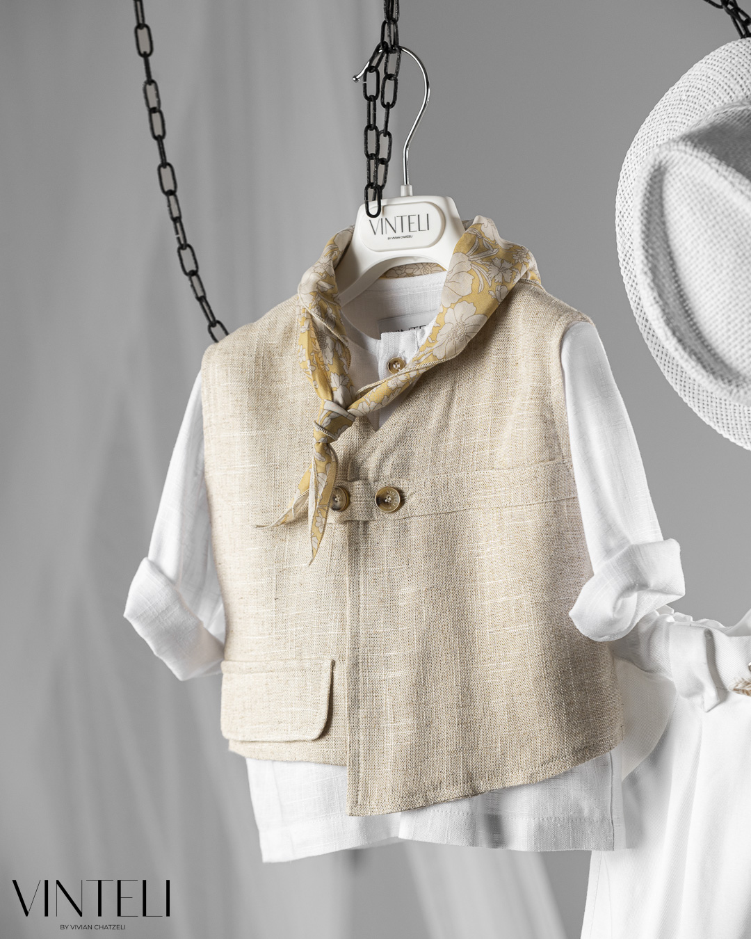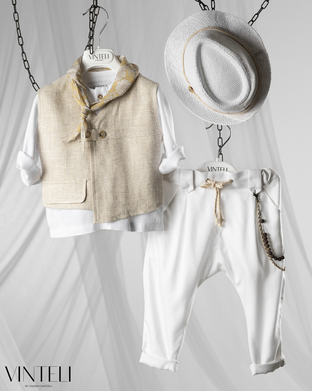Ένα σύγχρονο και ιδιαίτερο βαπτιστικό σύνολο που συνδυάζει άνεση και στυλ. Περιλαμβάνει πουκάμισο, γιλέκο με minimal γραμμή και κουμπιά, παντελόνι με χαλαρή εφαρμογή και ρεβέρ, καθώς και καπέλο. Το φουλάρι δίνει μια πιο ανάλαφρη, καλοκαιρινή διάθεση, ιδανική για ξεχωριστές στιγμές.