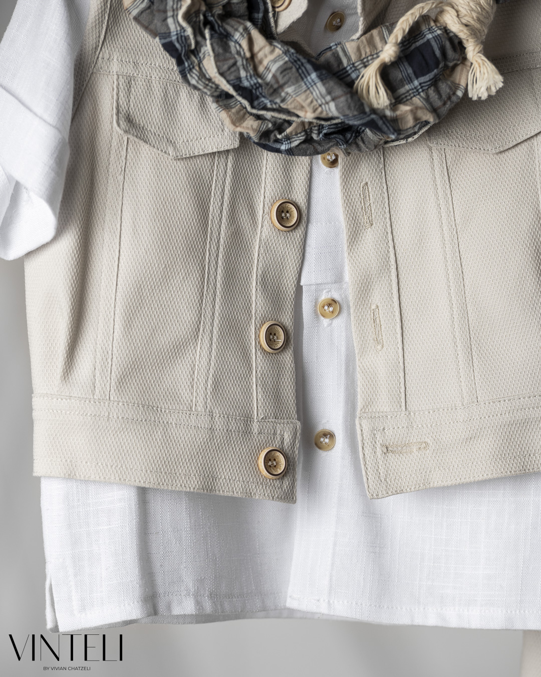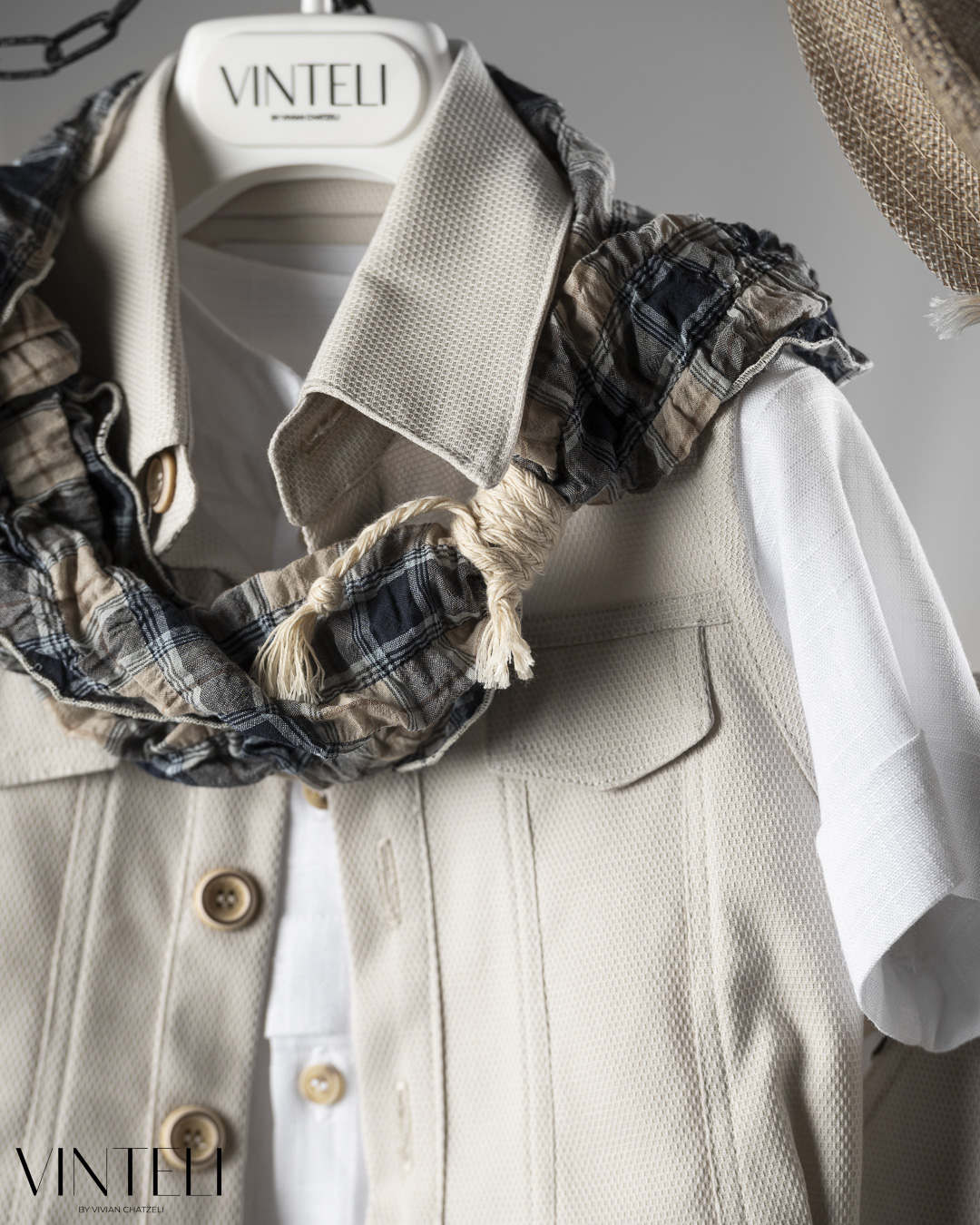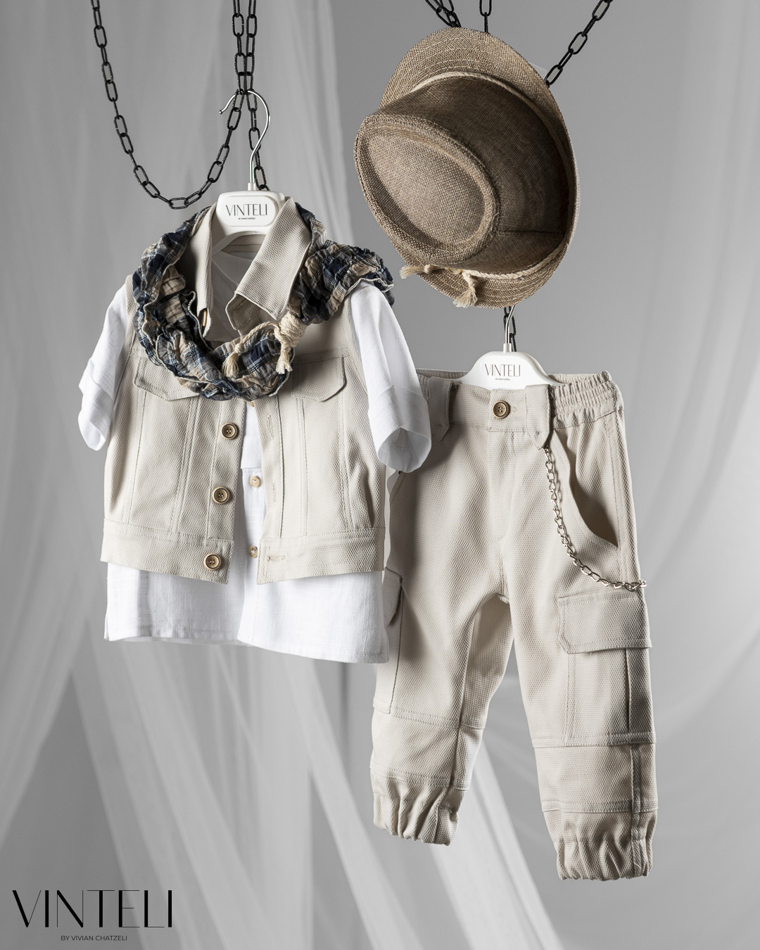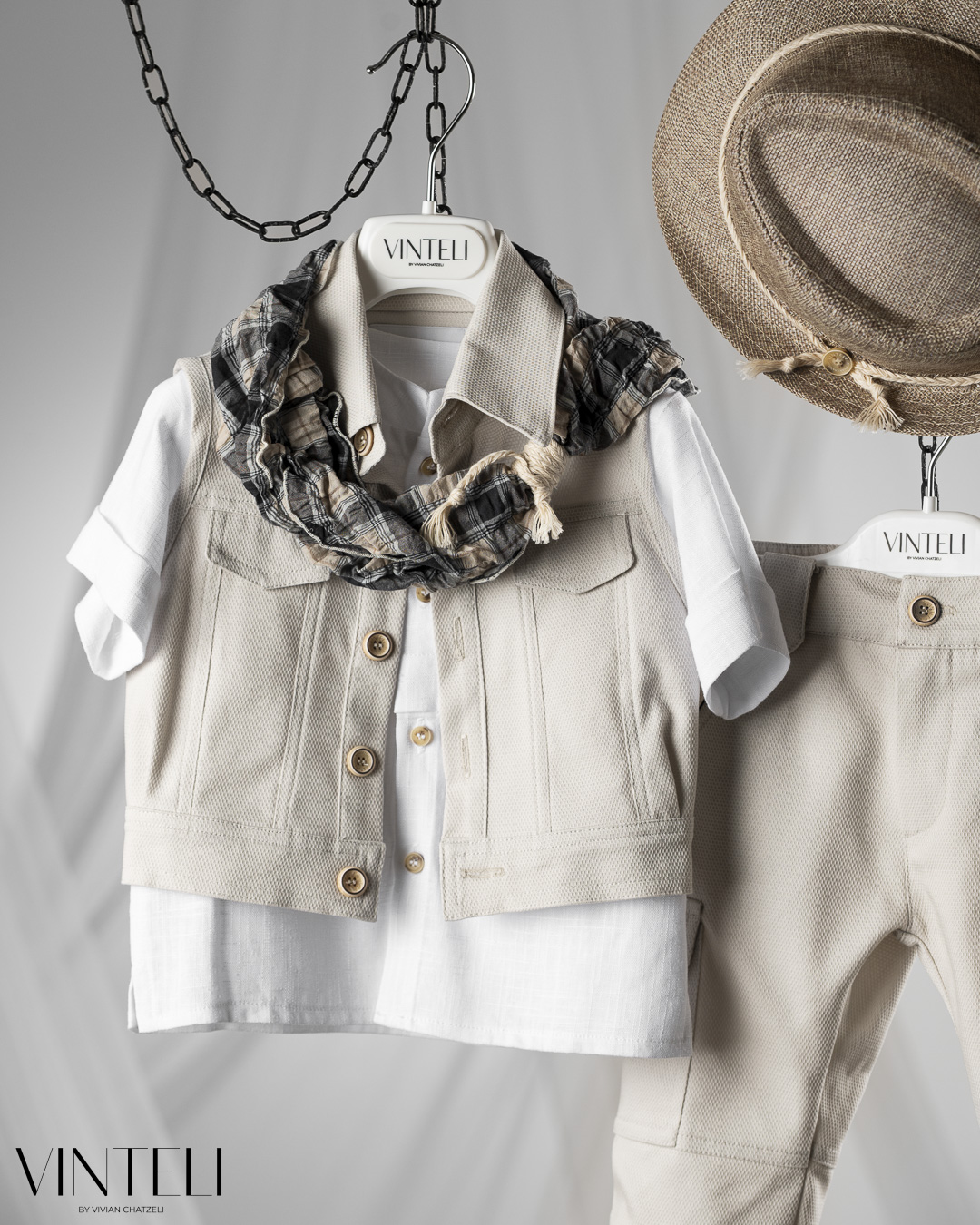 Ένα απλό και καλαίσθητο βαπτιστικό σύνολο με έμφαση στην άνεση. Το πουκάμισο συνδυάζεται με γιλέκο σε καθαρή γραμμή, ενώ το παντελόνι τύπου cargo με ίσιο τελείωμα και τσέπες δίνει πιο χαλαρό και σύγχρονο χαρακτήρα στο σύνολο. Το φουλάρι προσθέτει μία διακριτική πινελιά, ενώ οι απαλές αποχρώσεις δημιουργούν μία ήρεμη και κομψή εικόνα.
