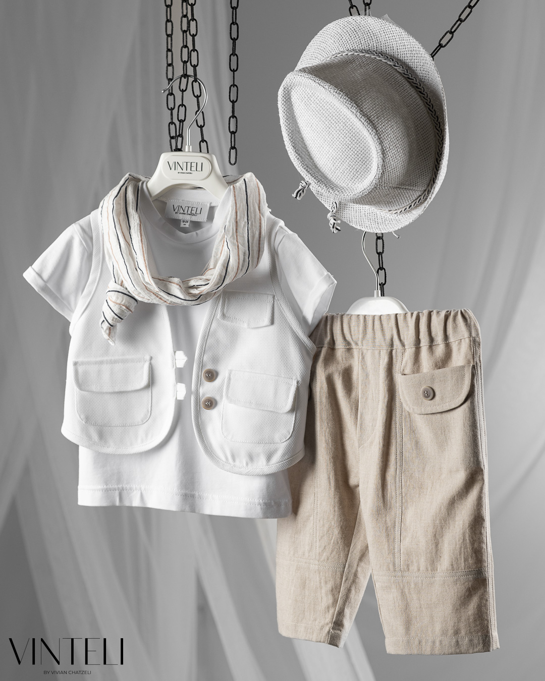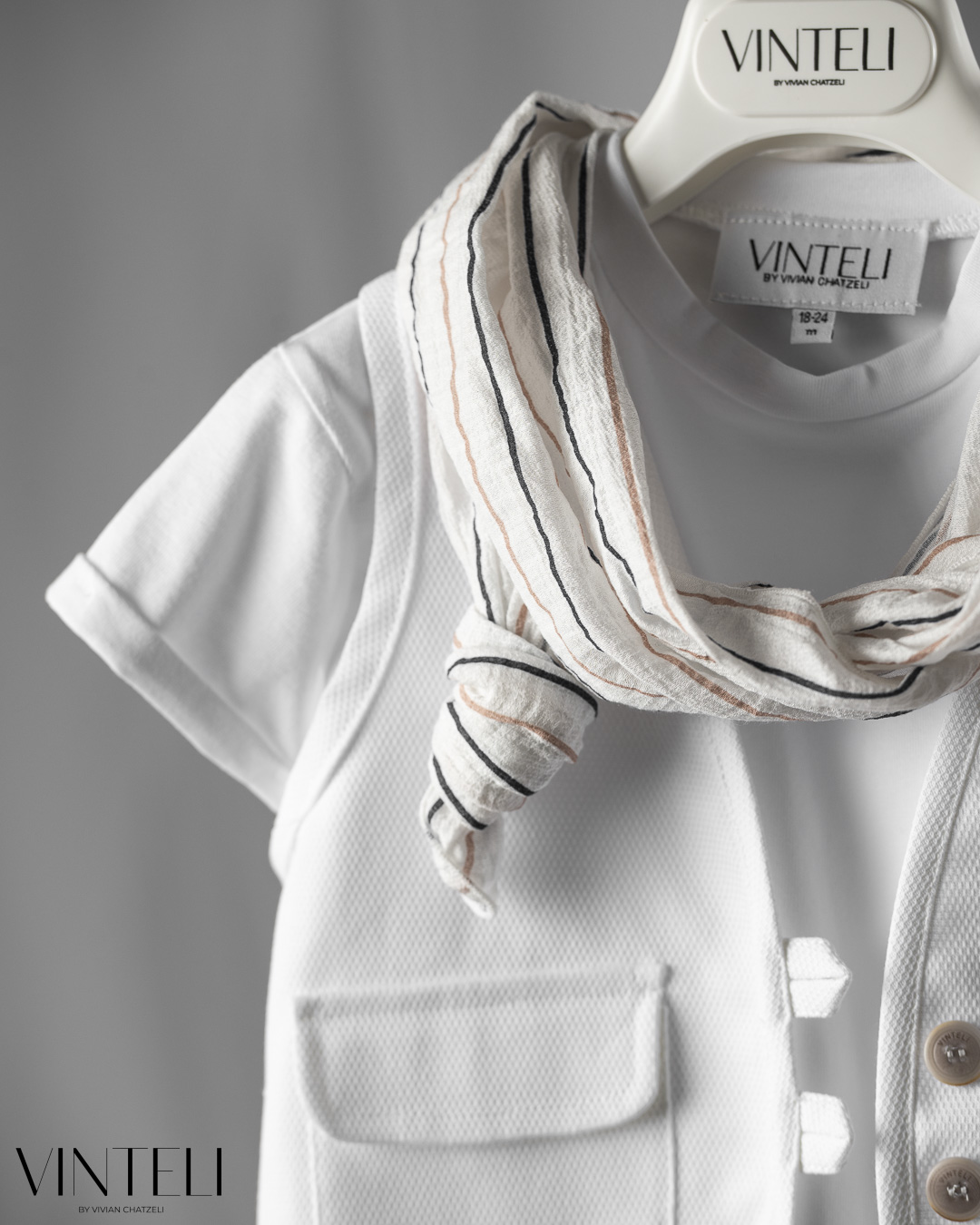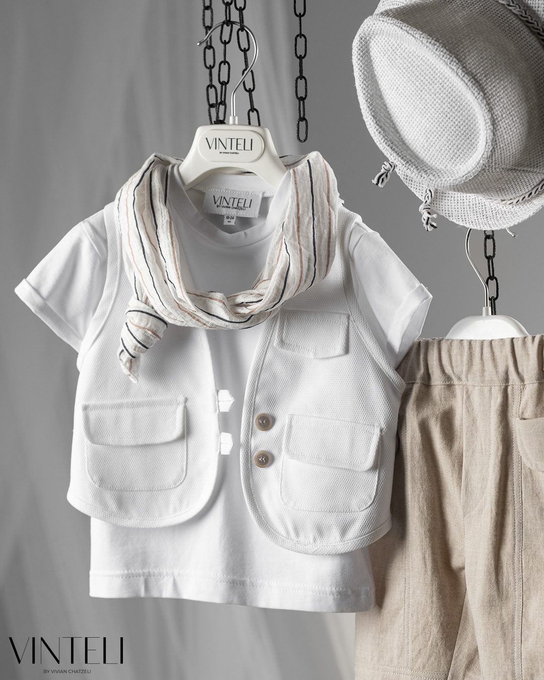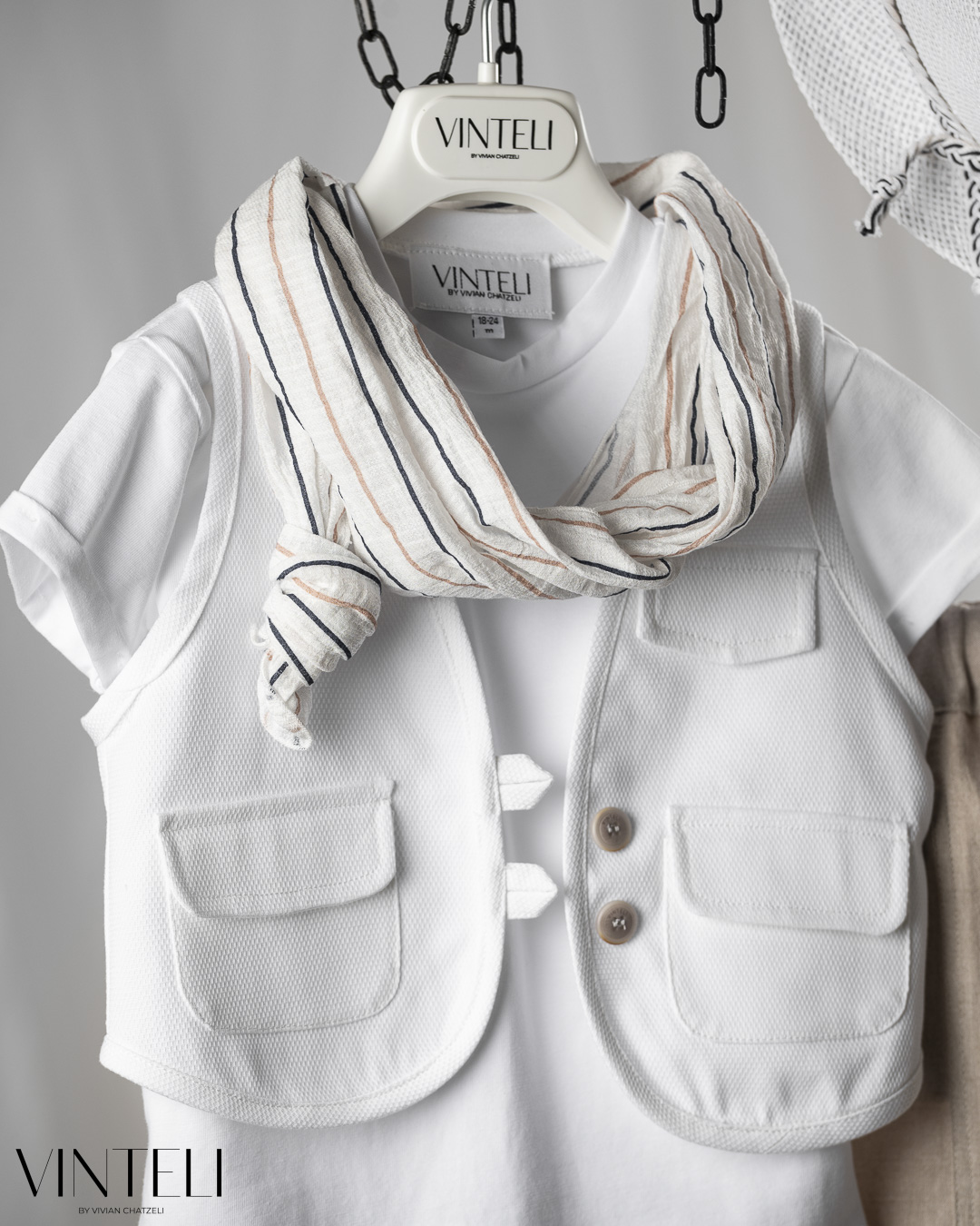 Ένα σύνολο με καθαρή αισθητική και ανάλαφρη διάθεση. Το λευκό t-shirt συνδυάζεται με γιλέκο σε φωτεινή, ουδέτερη απόχρωση, ενώ το παντελόνι σε απαλό μπεζ δίνει μια ζεστή και φυσική ισορροπία στο σύνολο. Το ριγέ φουλάρι προσθέτει μια διακριτική λεπτομέρεια, ενώ το καπέλο ολοκληρώνει την εμφάνιση με κομψότητα και φρεσκάδα.