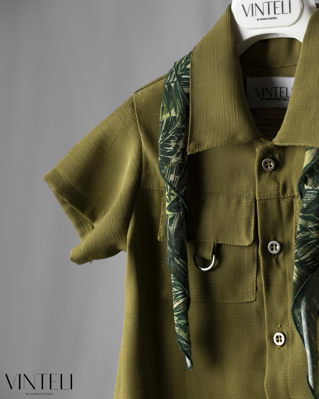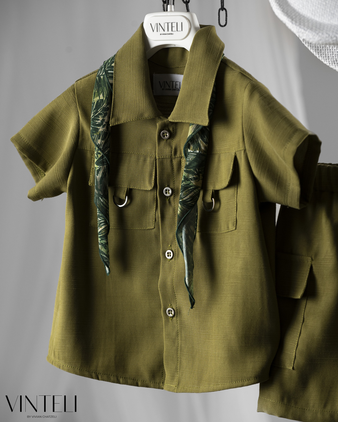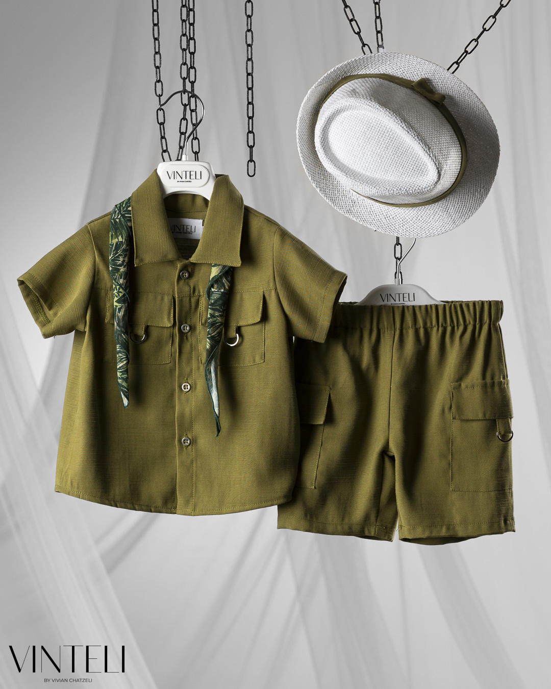 Ένα ιδιαίτερο σύνολο σε γήινες αποχρώσεις που ξεχωρίζει για τη φυσική του αισθητική. Το πουκάμισο και το σορτσάκι κινούνται στην ίδια λαδί απόχρωση, δημιουργώντας ένα ισορροπημένο αποτέλεσμα. Το φουλάρι με διακριτικό μοτίβο δίνει μια μικρή ένταση, ενώ το καπέλο ολοκληρώνει το σύνολο με καλοκαιρινή κομψότητα.