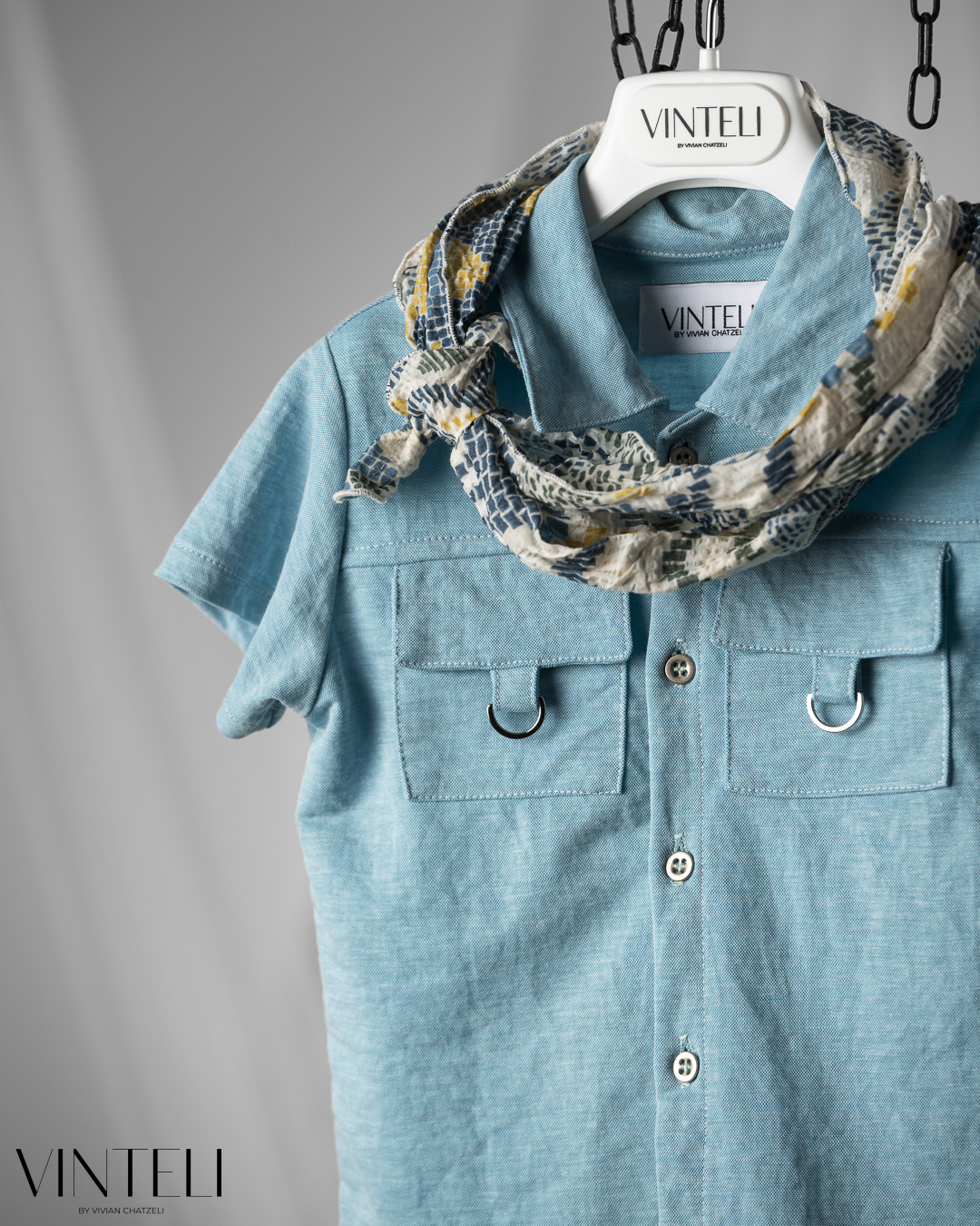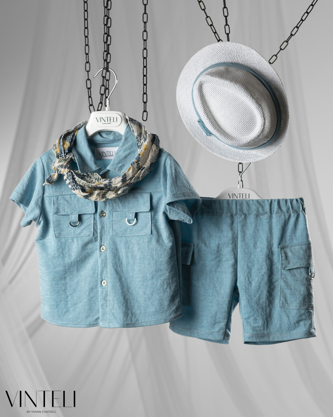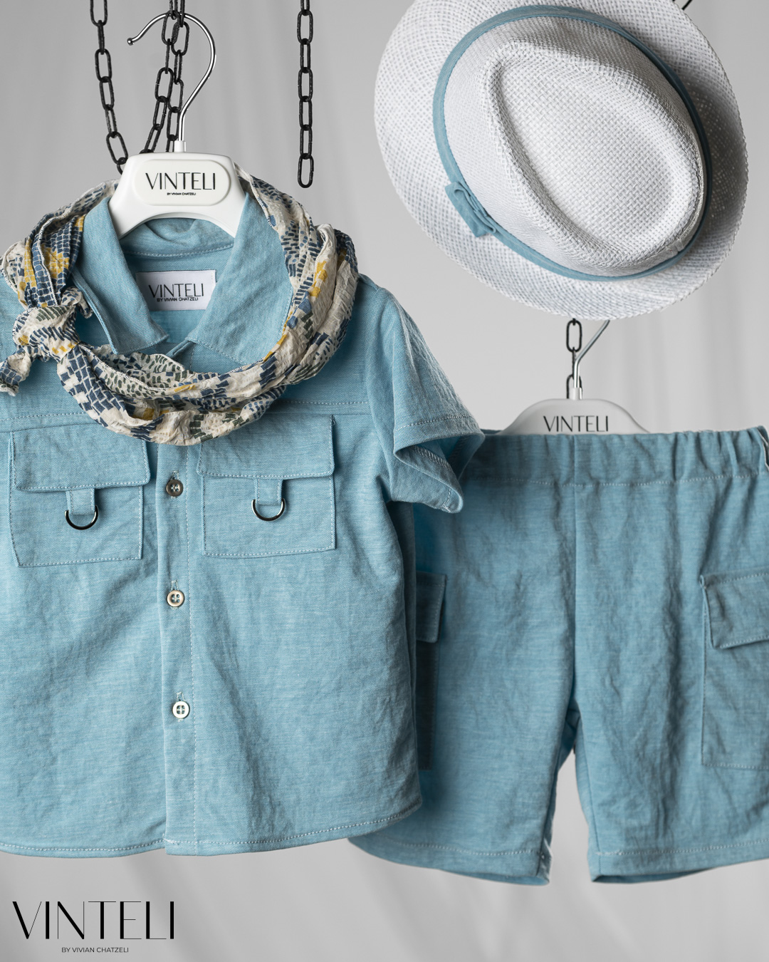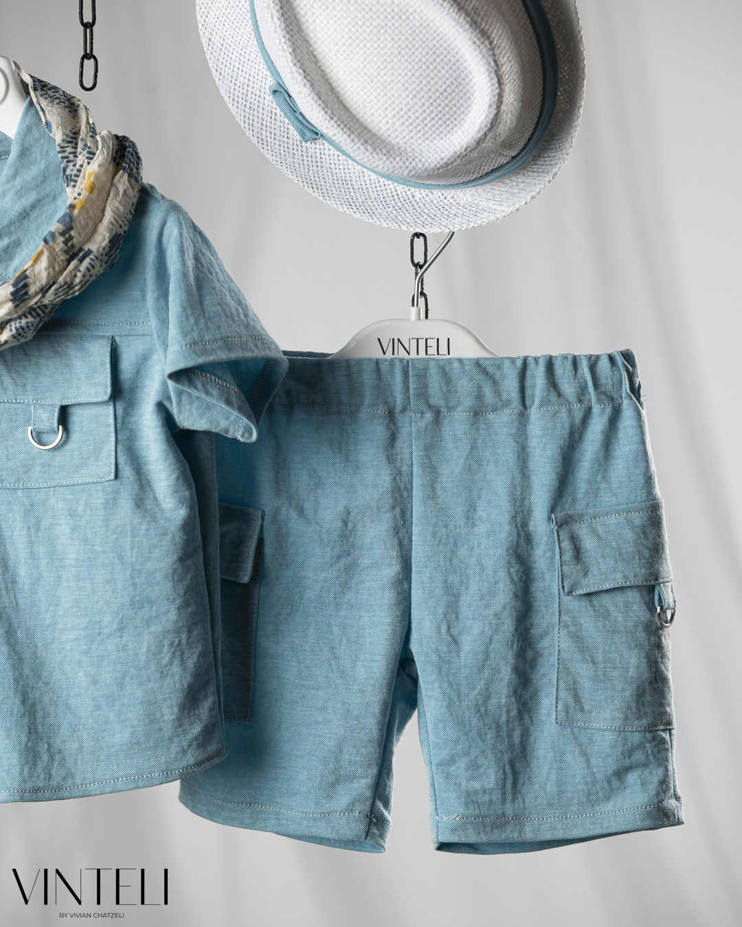 Ένα δροσερό και καλαίσθητο σύνολο, ιδανικό για καλοκαιρινές εμφανίσεις. Το πουκάμισο και το σορτσάκι είναι στο ίδιο χρώμα, χαρίζοντας μια αρμονική και καθαρή εικόνα. Το ανάλαφρο φουλάρι προσθέτει χαρακτήρα, ενώ το καπέλο συμπληρώνει το σύνολο.