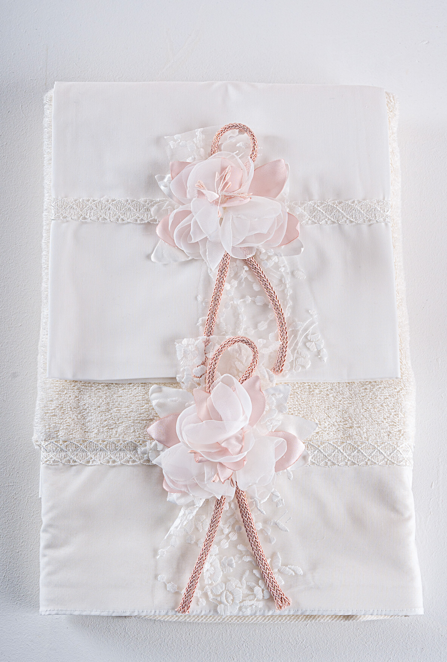 Σετ λαδόπανα Piccolino. Αποτελείται απο βαμβακερό λαδόπανο, πετσέτα 140*70εκ, εσώρουχα και πετσέτα ιερέα 30*50εκ. Στολισμένα με χειροποίητα υφασμάτινα λουλούδια.