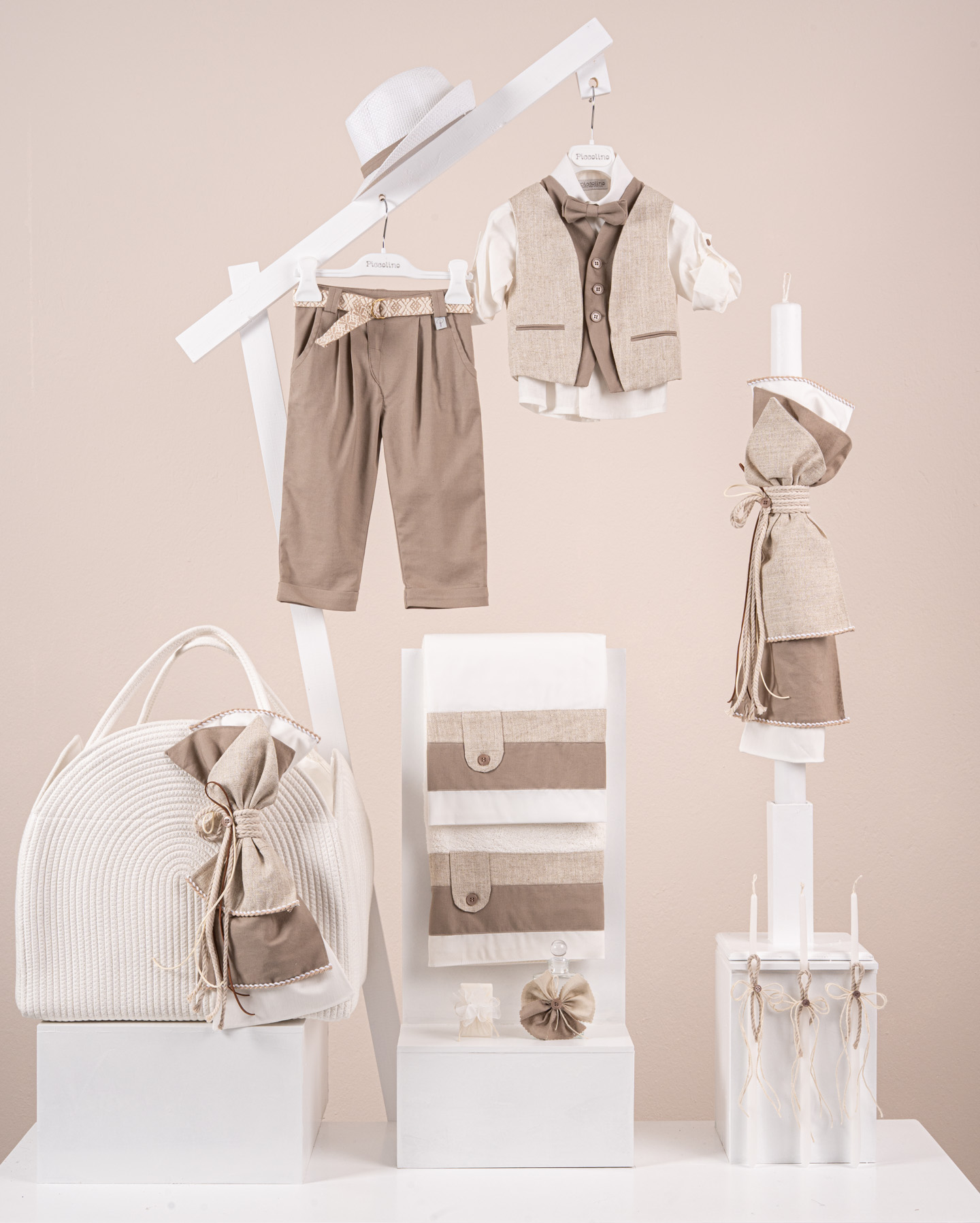 Βαπτιστικό πακέτο Piccolino Alessio mocha περιλαμβάνει κοστούμι ,σετ λαδόπανα, λαμπάδα, λαδοσετ και στολισμένη τσάντα ropes
