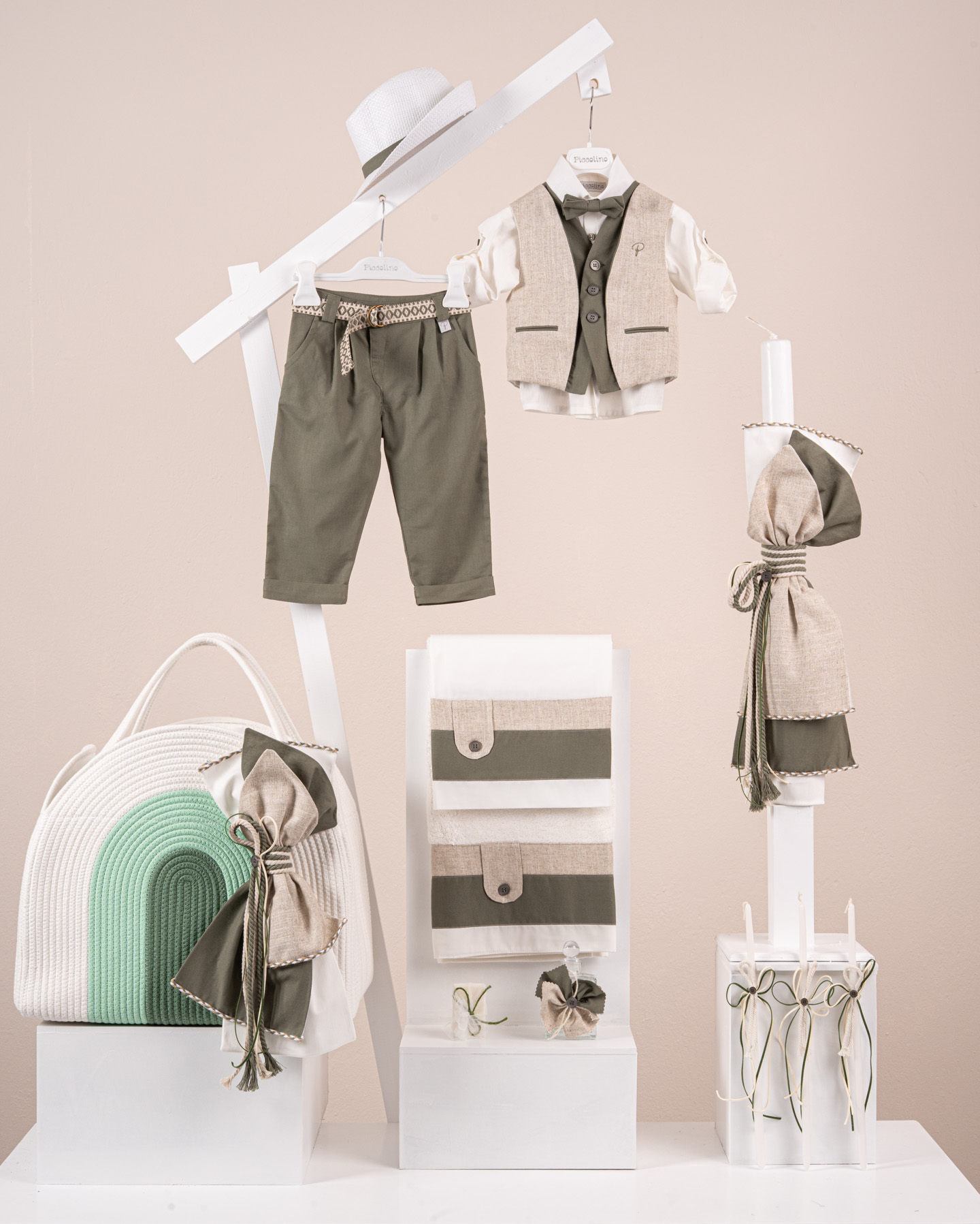 Βαπτιστικό πακέτο Piccolino Alessio olive περιλαμβάνει κοστούμι ,σετ λαδόπανα, λαμπάδα, λαδοσετ και στολισμένη τσάντα ropes