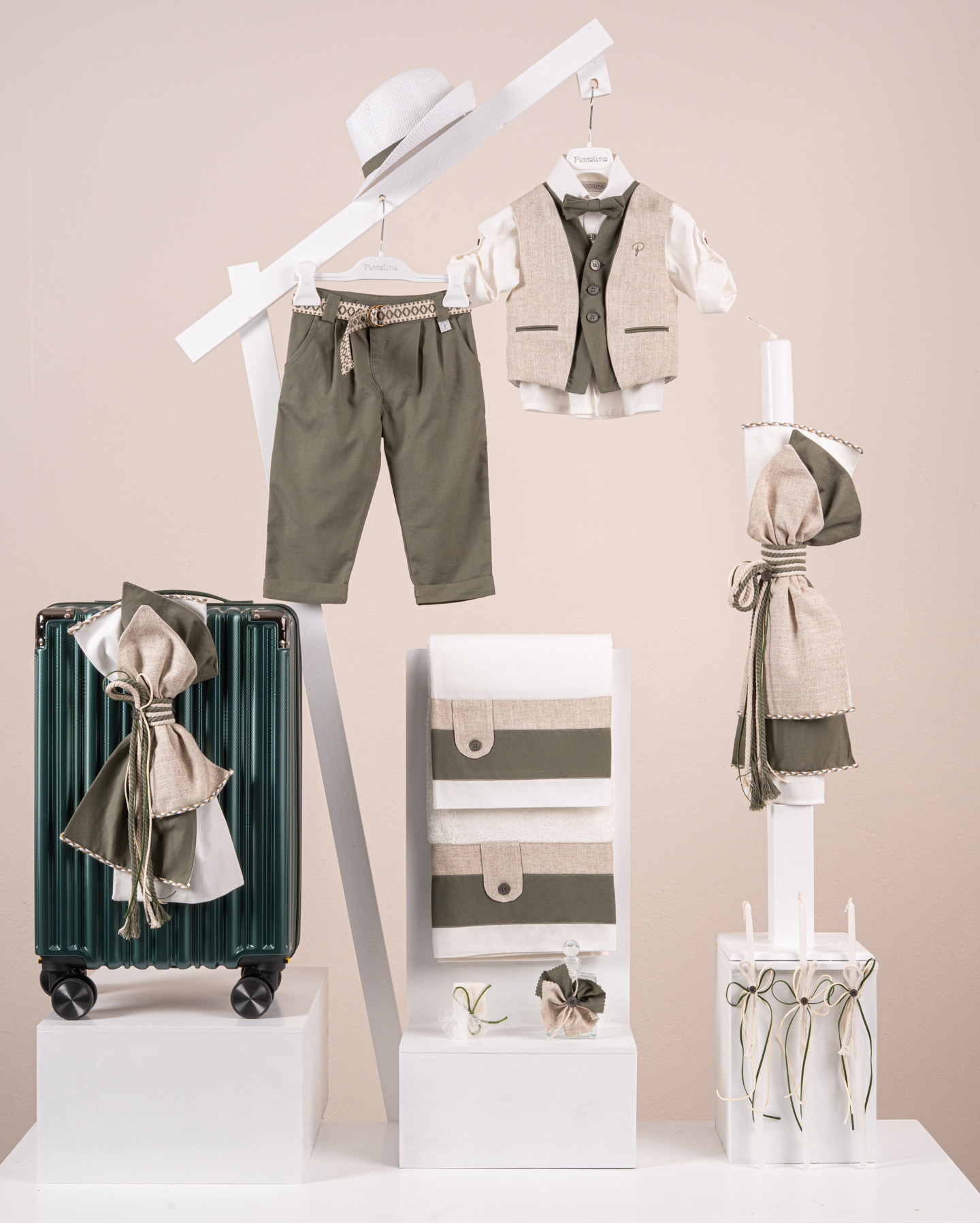 Βαπτιστικό πακέτο Piccolino Alessio olive περιλαμβάνει κοστούμι ,σετ λαδόπανα, λαμπάδα, λαδοσετ και στολισμένη βαλίτσα green