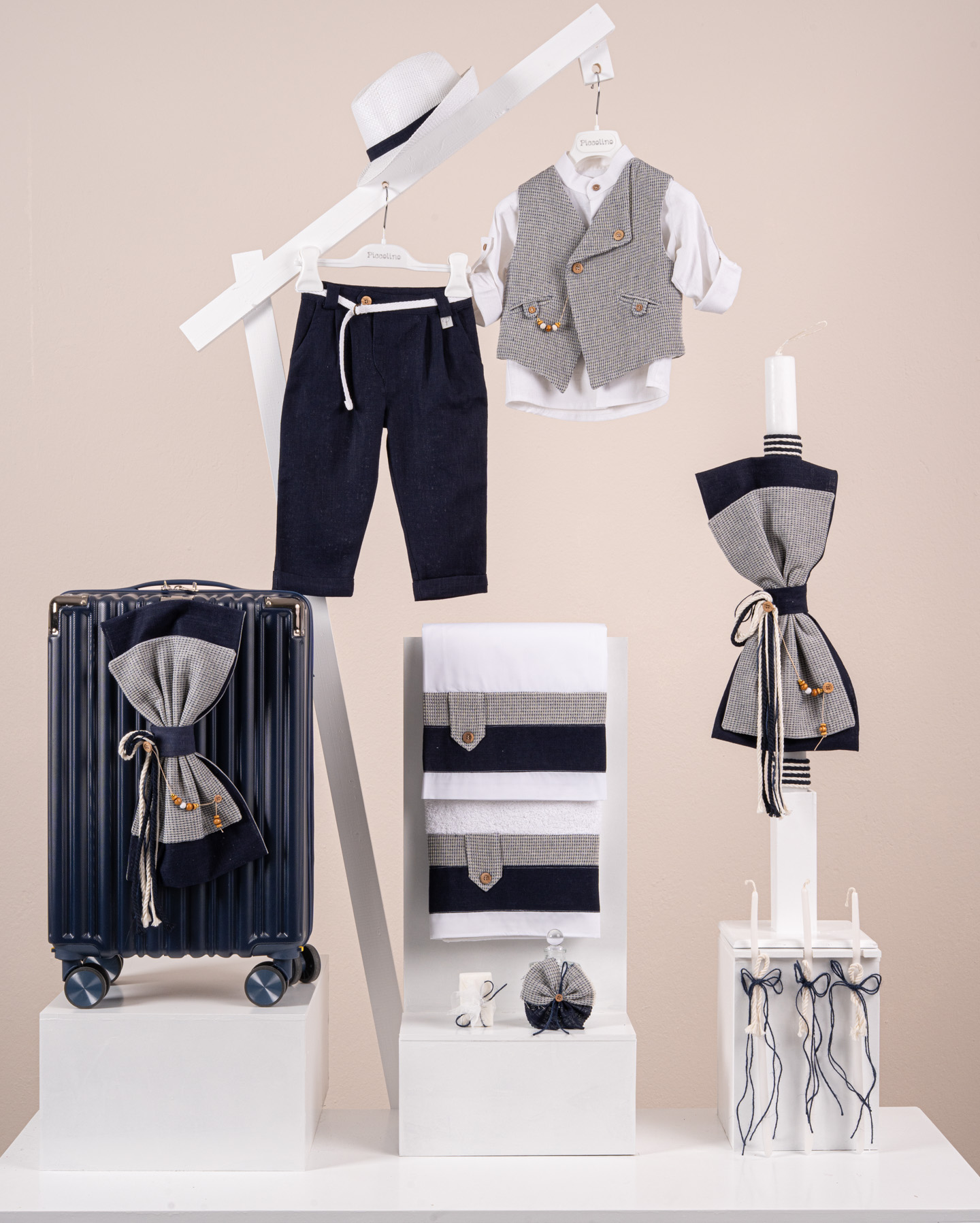 Βαπτιστικό πακέτο Piccolino Emilio navy περιλαμβάνει κοστούμι ,σετ λαδόπανα, λαμπάδα, λαδοσετ και στολισμένη βαλίτσα navy