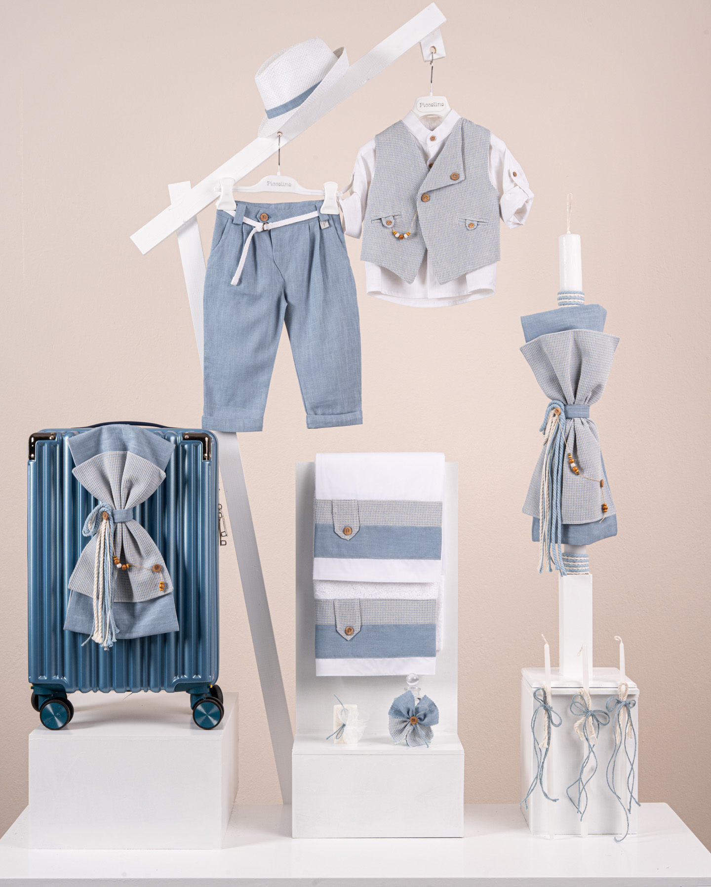 Βαπτιστικό πακέτο Piccolino Emilio raf περιλαμβάνει κοστούμι ,σετ λαδόπανα, λαμπάδα, λαδοσετ και στολισμένη βαλίτσα raf