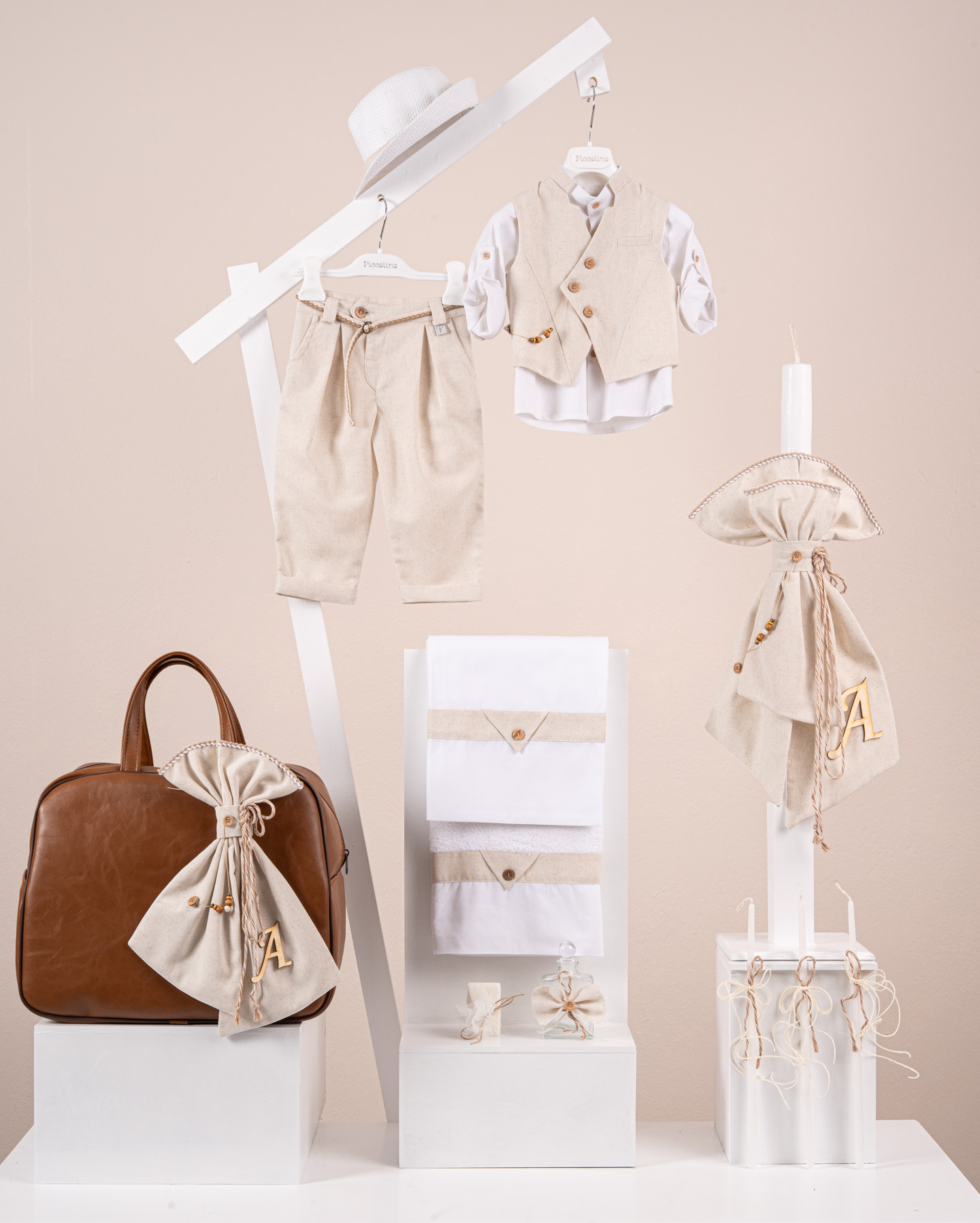Βαπτιστικό πακέτο Piccolino Enrique beige περιλαμβάνει κοστούμι ,σετ λαδόπανα, λαμπάδα, λαδοσετ και στολισμένη τσάντα καφέ