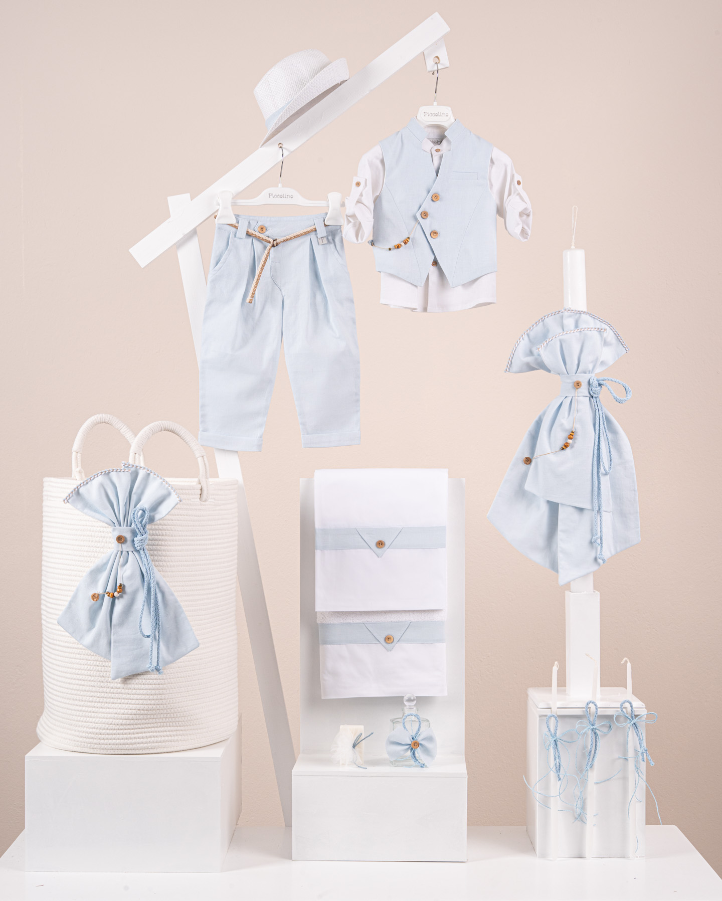 Βαπτιστικό πακέτο Piccolino Enrique ciele περιλαμβάνει κοστούμι ,σετ λαδόπανα, λαμπάδα, λαδοσετ και στολισμένο barel off white