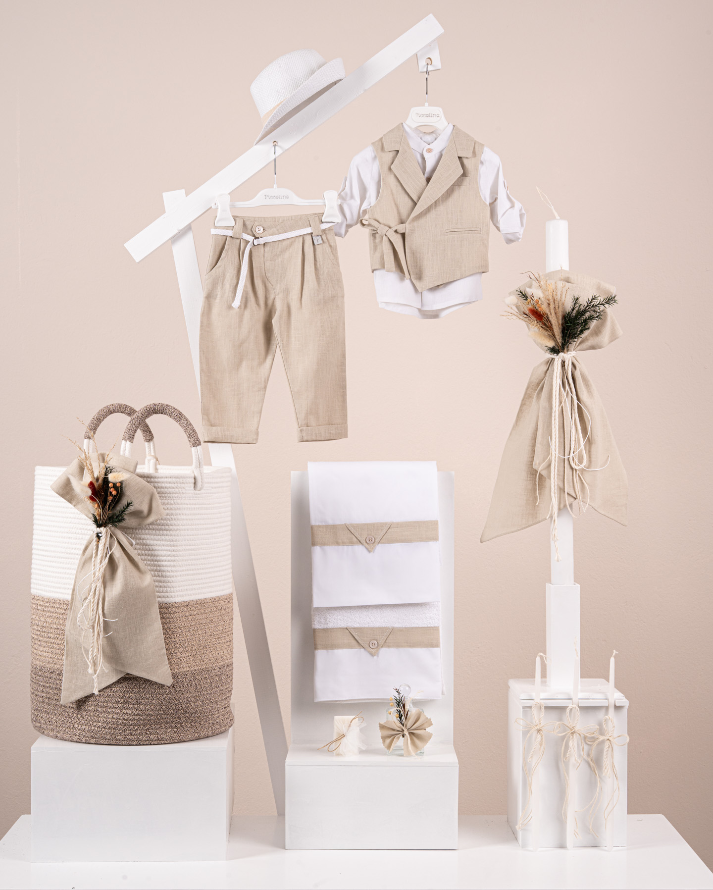 Βαπτιστικό πακέτο Piccolino Fabio beige περιλαμβάνει κοστούμι ,σετ λαδόπανα, λαμπάδα, λαδοσετ και στολισμένο barel beige