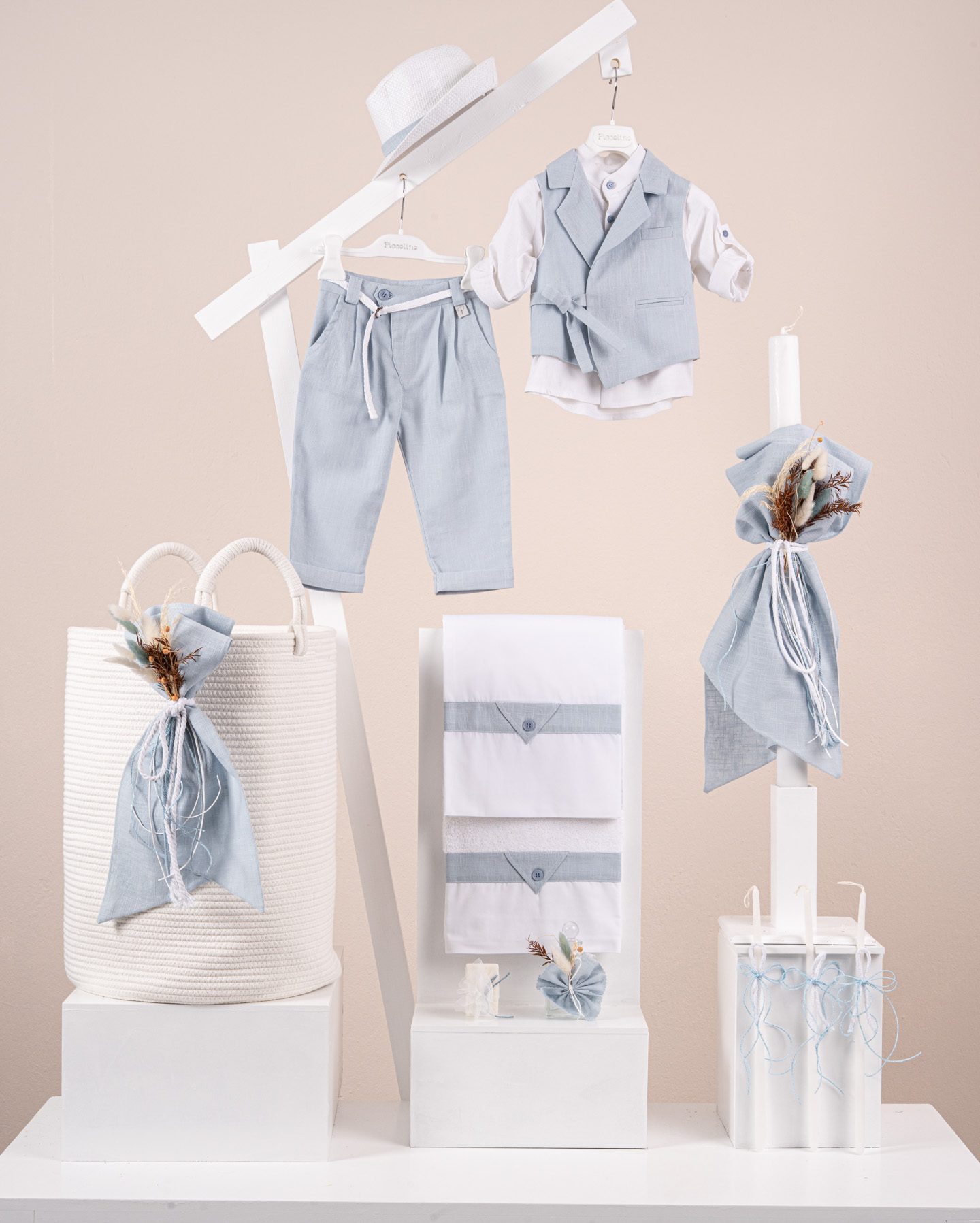 Βαπτιστικό πακέτο Piccolino Fabio light blue περιλαμβάνει κοστούμι ,σετ λαδόπανα, λαμπάδα, λαδοσετ και στολισμένο barel off white