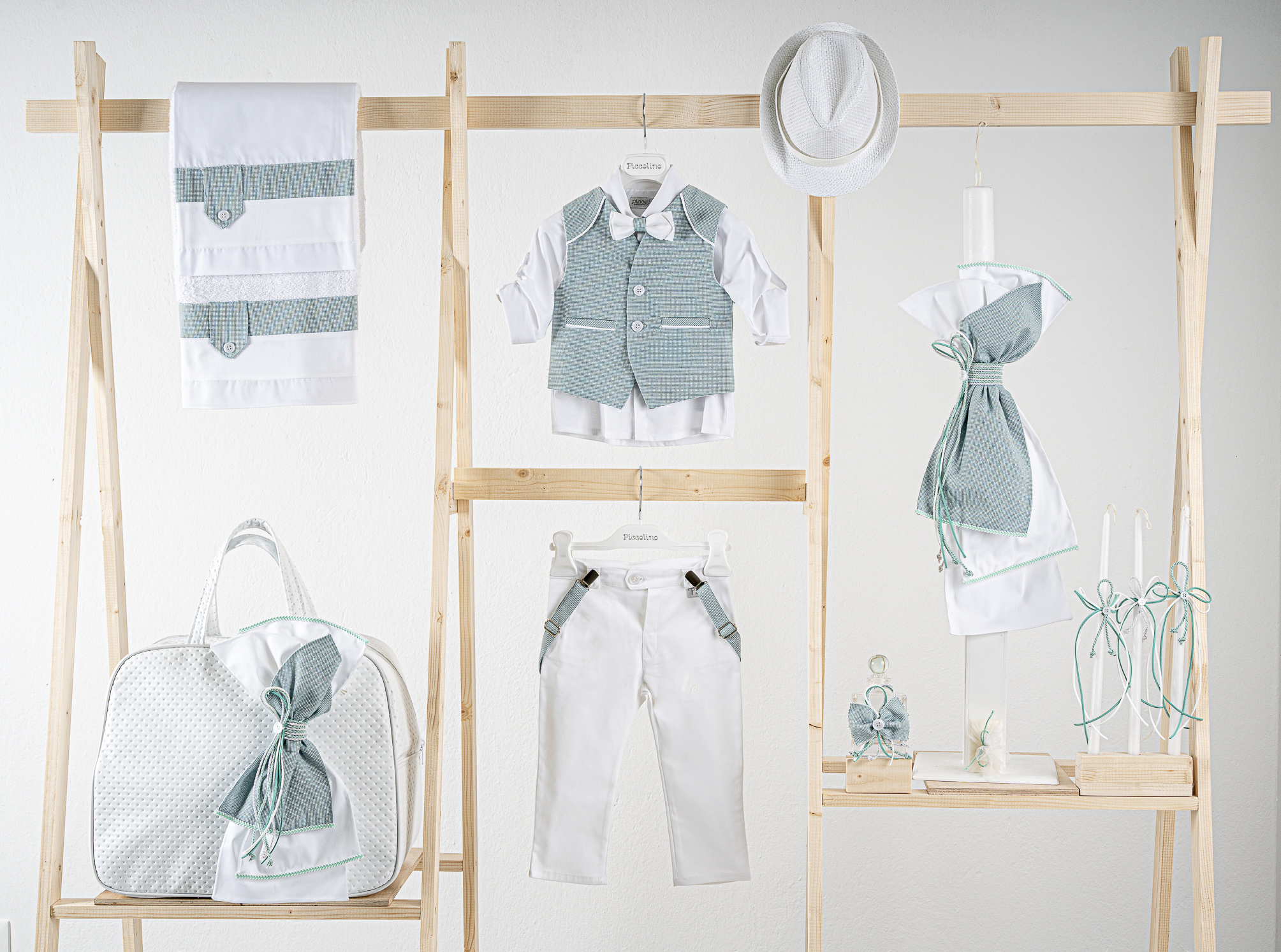 Βαπτιστικό πακέτο Piccolino Francisco mint white περιλαμβάνει κοστούμι ,σετ λαδόπανα, λαμπάδα, λαδοσετ και στολισμένη τσάντα καπιτονέ