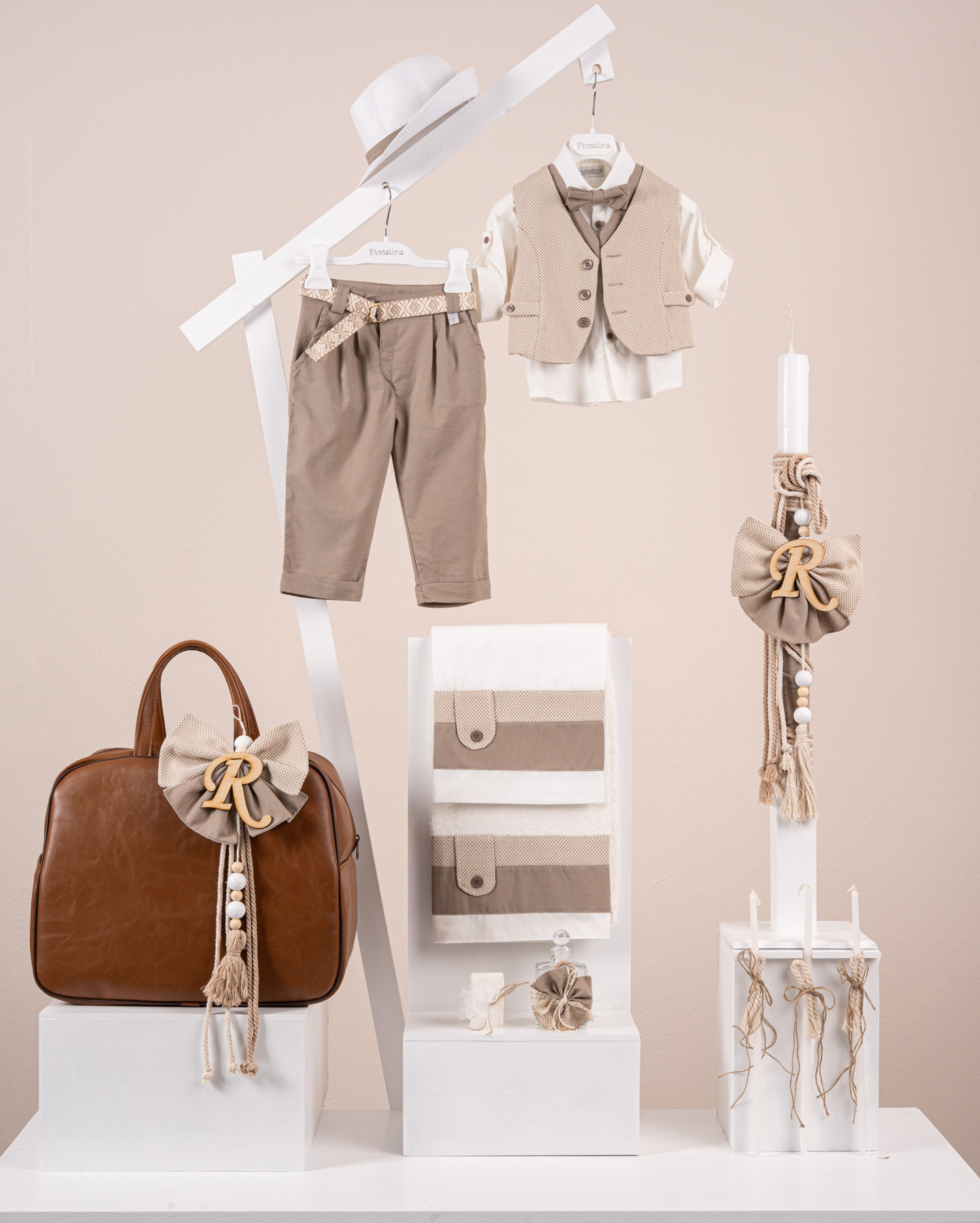Βαπτιστικό πακέτο Piccolino Giulio mocha περιλαμβάνει κοστούμι ,σετ λαδόπανα, λαμπάδα, λαδοσετ και στολισμένη τσάντα καφέ
