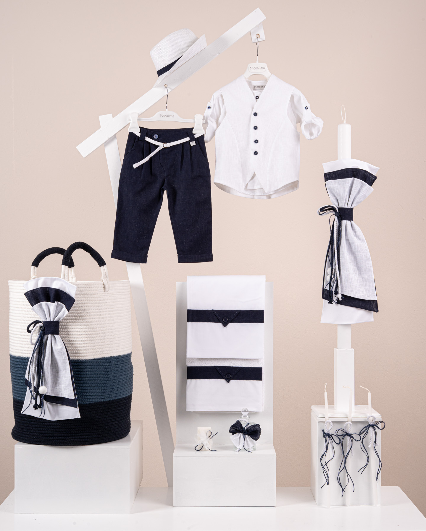 Βαπτιστικό πακέτο Piccolino Hector navy περιλαμβάνει κοστούμι ,σετ λαδόπανα, λαμπάδα, λαδοσετ και στολισμένο barel blue
