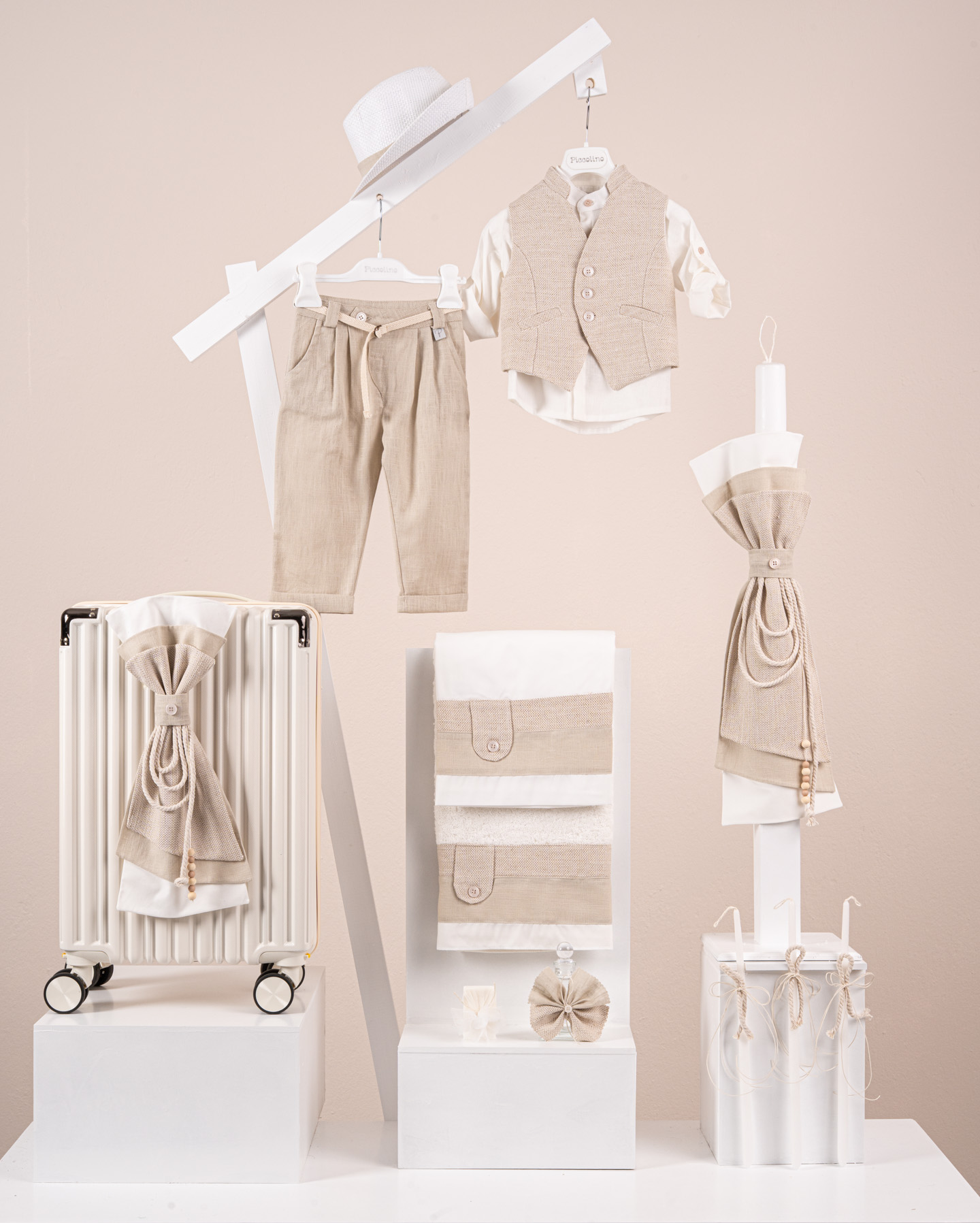 Βαπτιστικό πακέτο Piccolino Logan beige περιλαμβάνει κοστούμι ,σετ λαδόπανα, λαμπάδα, λαδοσετ και στολισμένη βαλίτσα cream