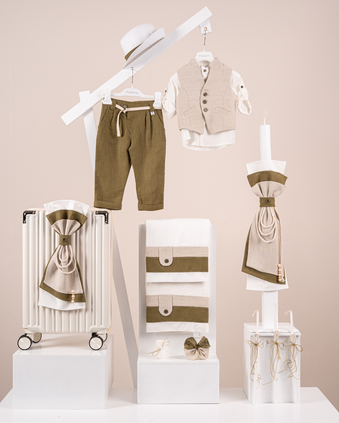 Βαπτιστικό πακέτο Piccolino Logan golden olive περιλαμβάνει κοστούμι ,σετ λαδόπανα, λαμπάδα, λαδοσετ και στολισμένη βαλίτσα cream