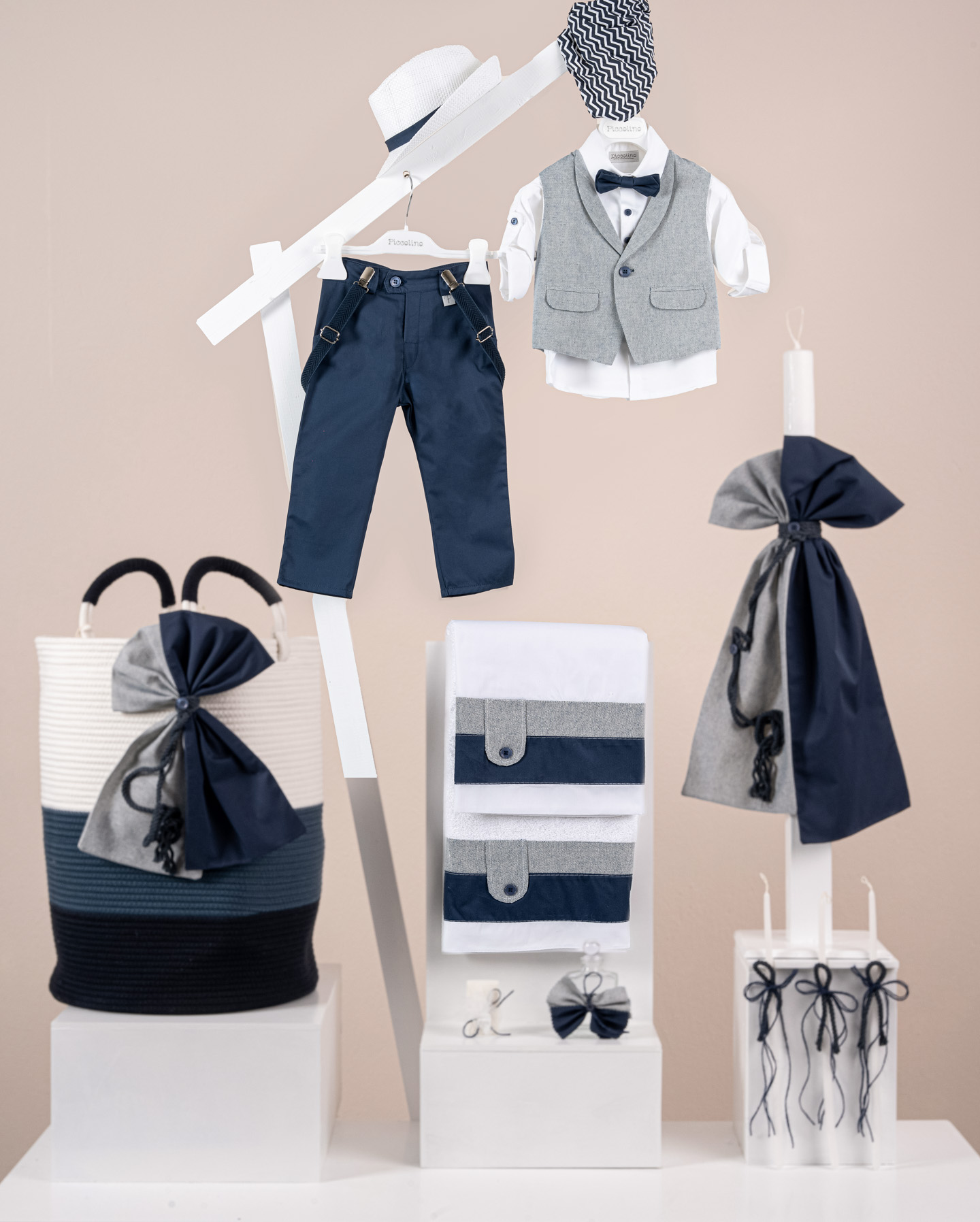 Βαπτιστικό πακέτο Piccolino Nico aegean περιλαμβάνει κοστούμι ,σετ λαδόπανα, λαμπάδα, λαδοσετ και στολισμένο Barel Navy