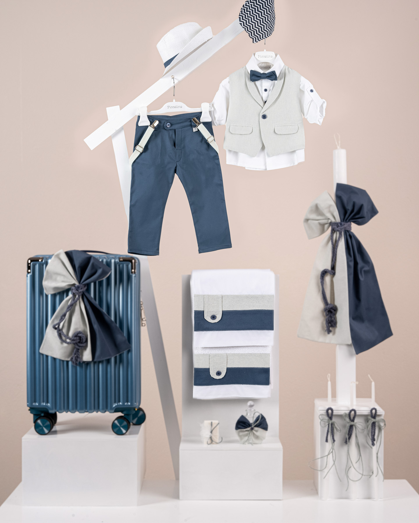Βαπτιστικό πακέτο Piccolino Nico cobalt περιλαμβάνει κοστούμι ,σετ λαδόπανα, λαμπάδα, λαδοσετ και στολισμένη βαλίτσα raf