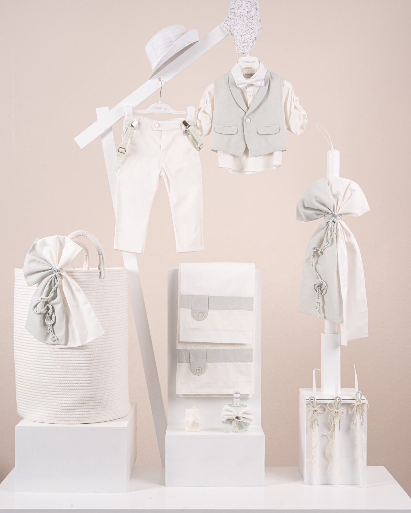 Βαπτιστικό πακέτο Piccolino Nico ivory περιλαμβάνει κοστούμι ,σετ λαδόπανα, λαμπάδα, λαδοσετ και στολισμένο barel off white