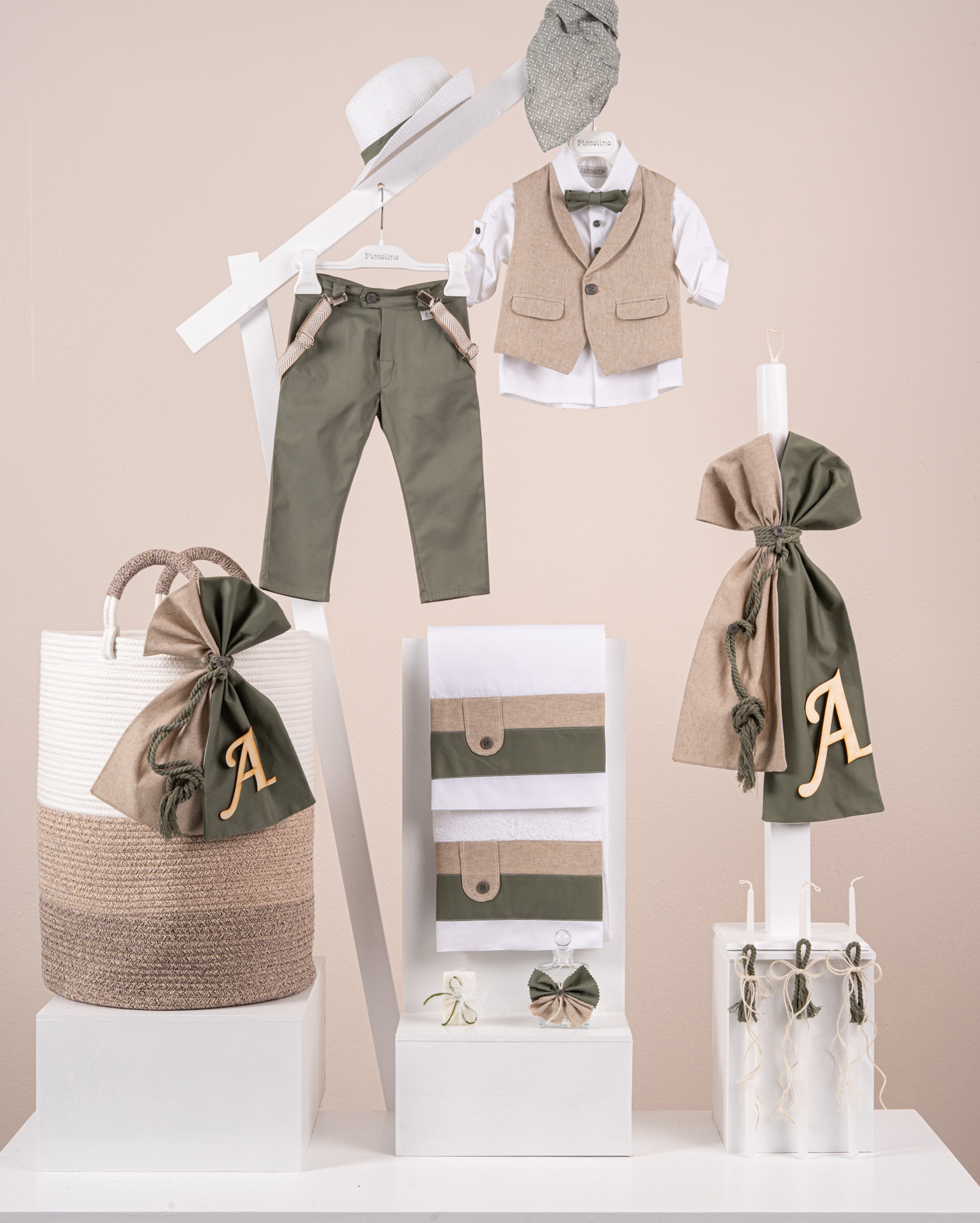 Βαπτιστικό πακέτο Piccolino Nico olive περιλαμβάνει κοστούμι ,σετ λαδόπανα, λαμπάδα, λαδοσετ και στολισμένο barel beige