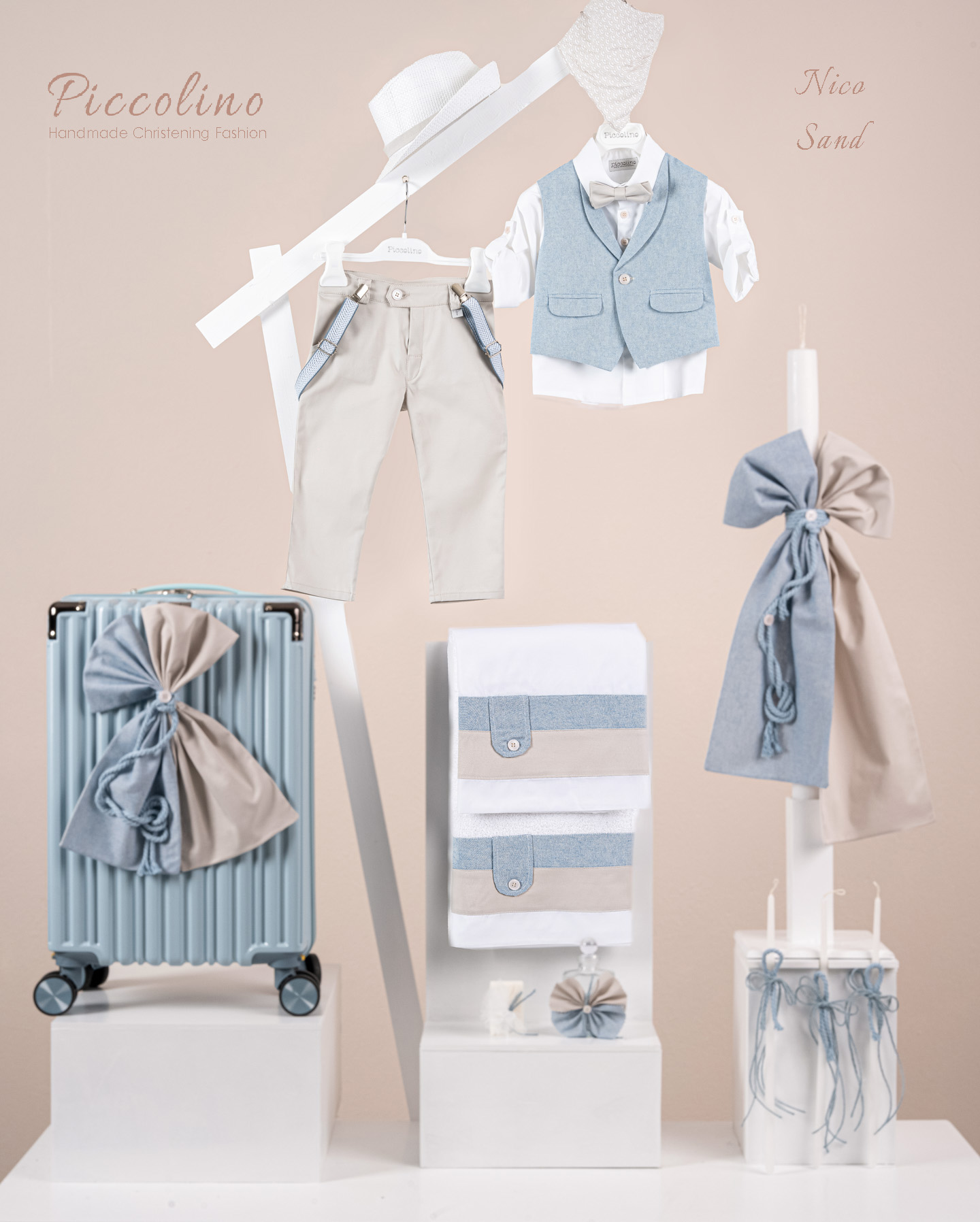 Βαπτιστικό πακέτο Piccolino Nico sand περιλαμβάνει κοστούμι ,σετ λαδόπανα, λαμπάδα, λαδοσετ και στολισμένη βαλίτσα light blue