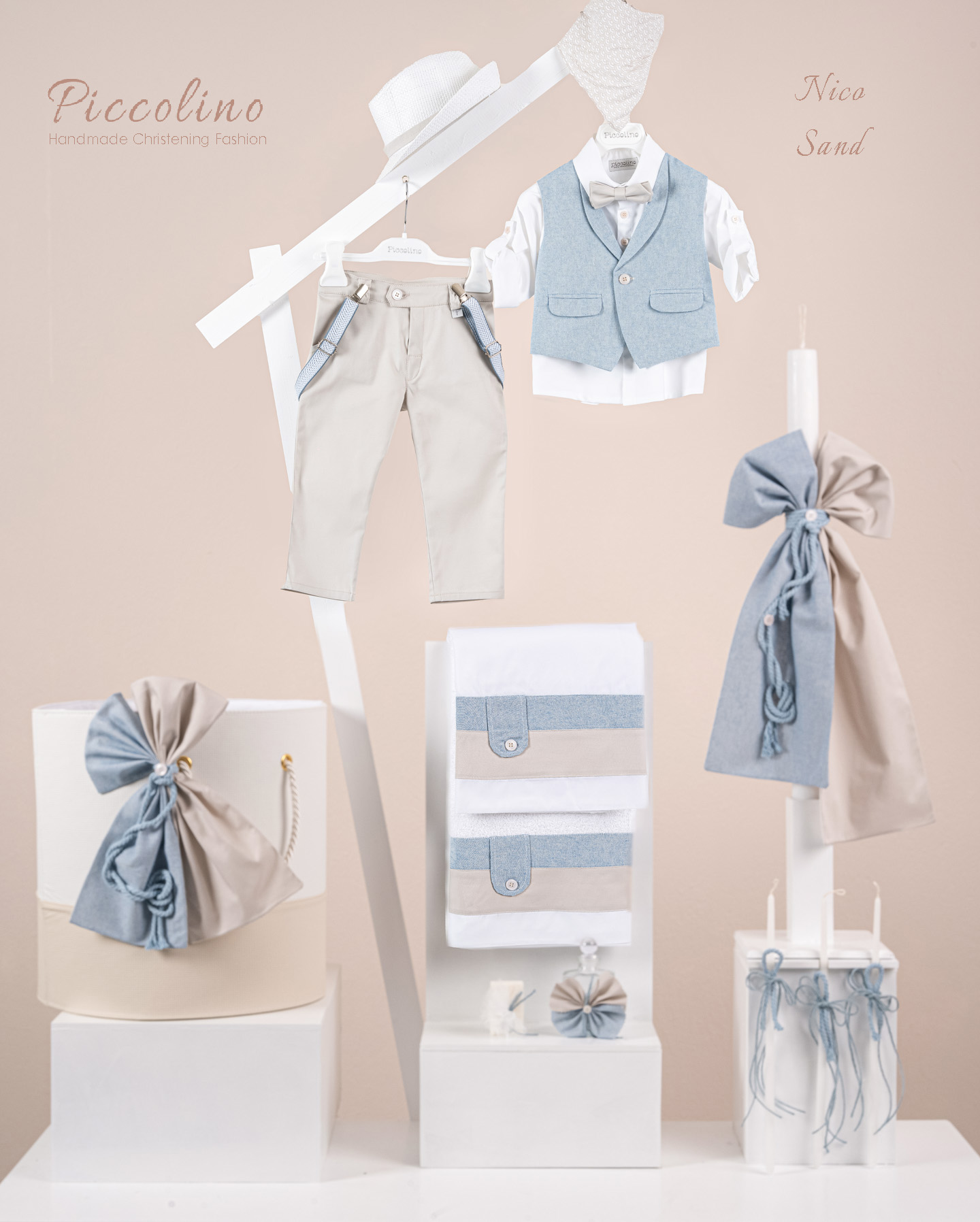 Βαπτιστικό πακέτο Piccolino Nico sand περιλαμβάνει κοστούμι ,σετ λαδόπανα, λαμπάδα, λαδοσετ και στολισμένο καλάθι δερμάτινο