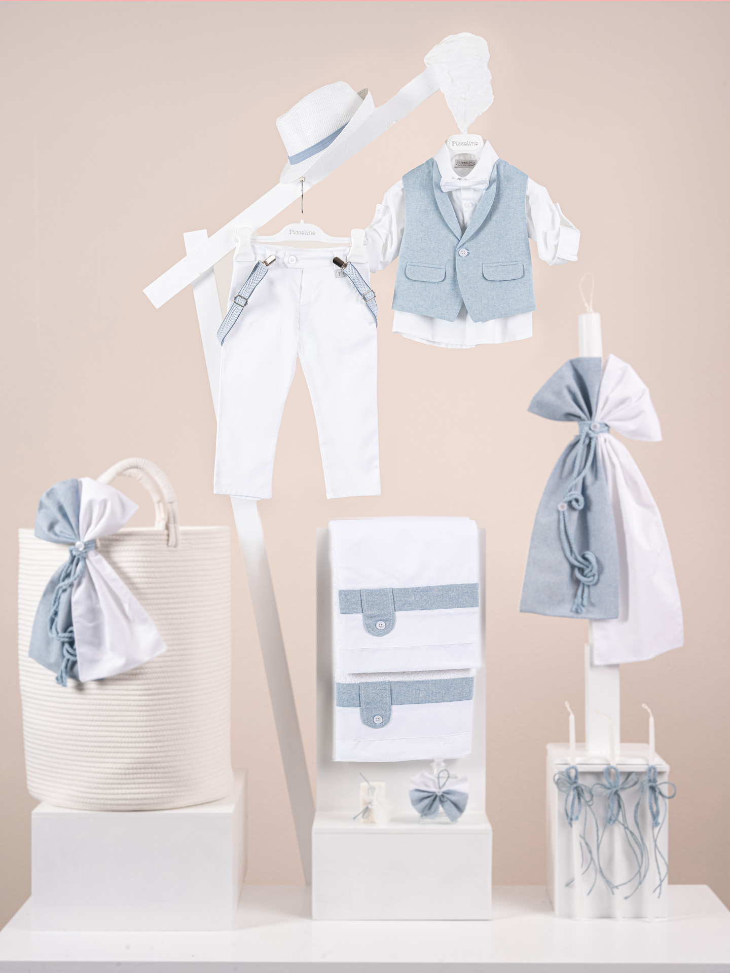 Βαπτιστικό πακέτο Piccolino Nico white περιλαμβάνει κοστούμι ,σετ λαδόπανα, λαμπάδα, λαδοσετ και στολισμένο barel off white