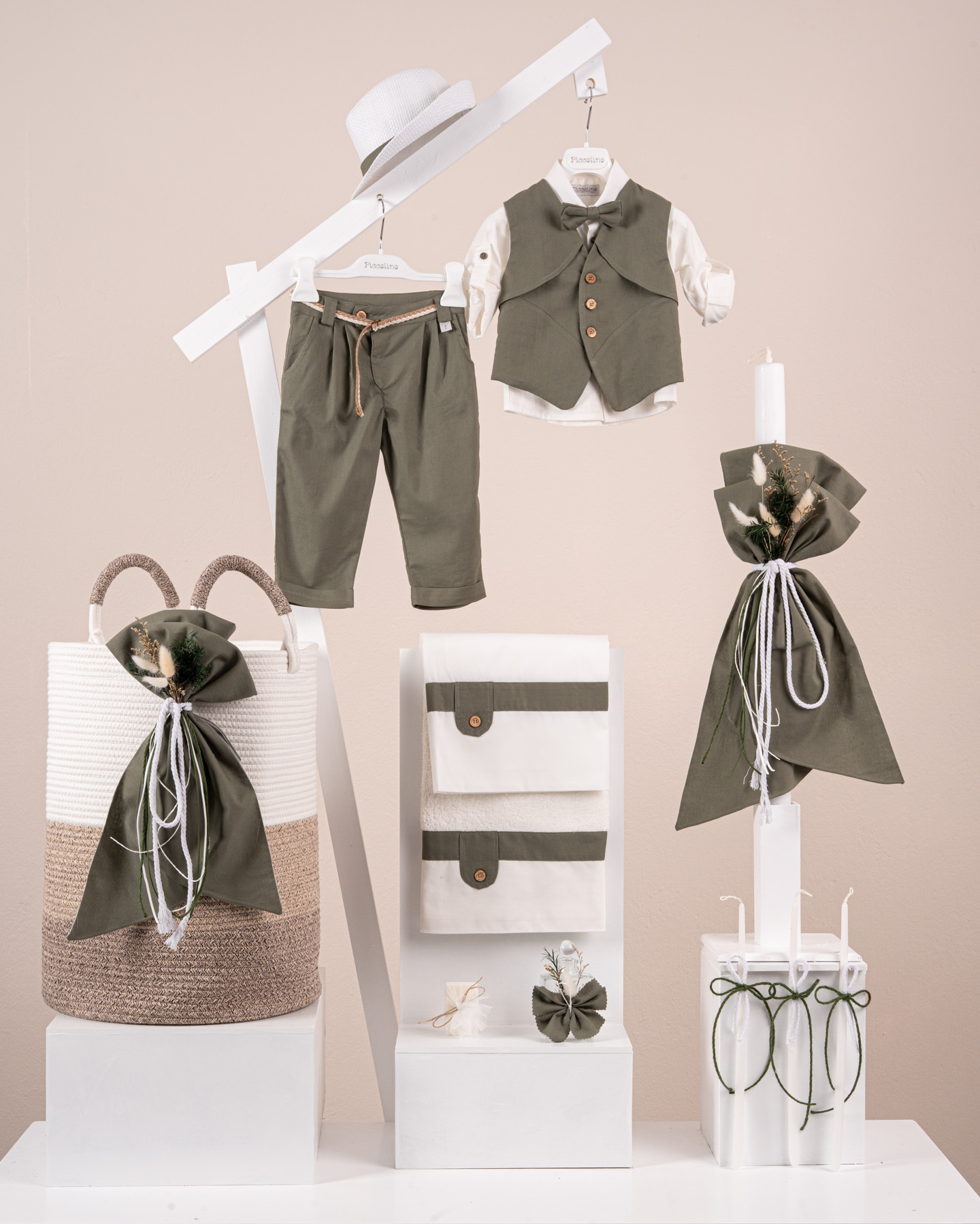 Βαπτιστικό πακέτο Piccolino Riccardo olive περιλαμβάνει κοστούμι ,σετ λαδόπανα, λαμπάδα, λαδοσετ και στολισμένο barel beige