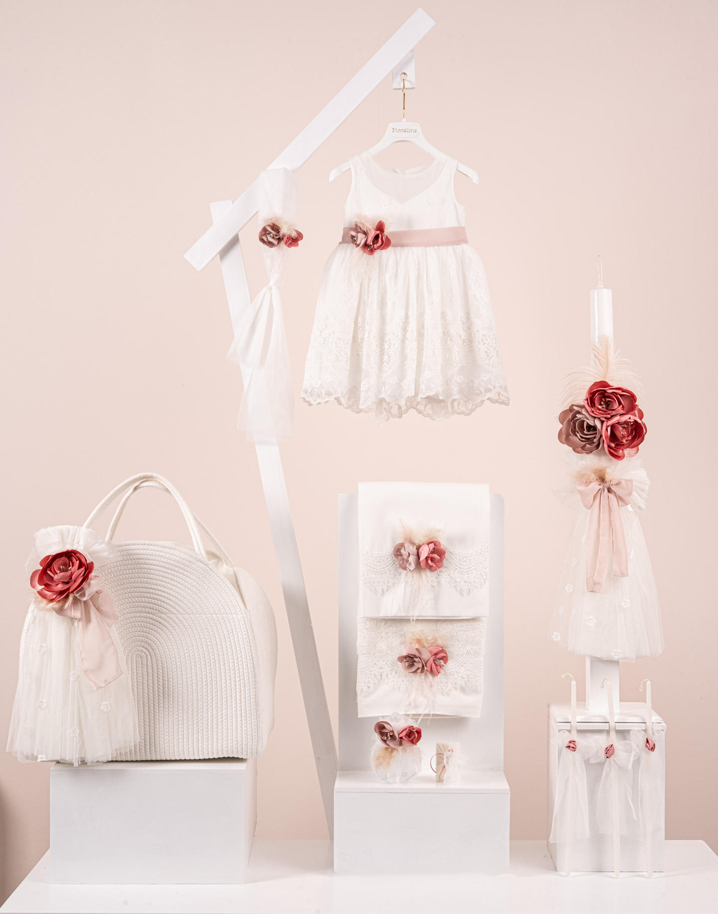 Βαπτιστικό πακέτο Piccolino Alessia ivory περιλαμβάνει φόρεμα ,σετ λαδόπανα, λαμπάδα, λαδοσετ και στολισμένη τσάντα ropes