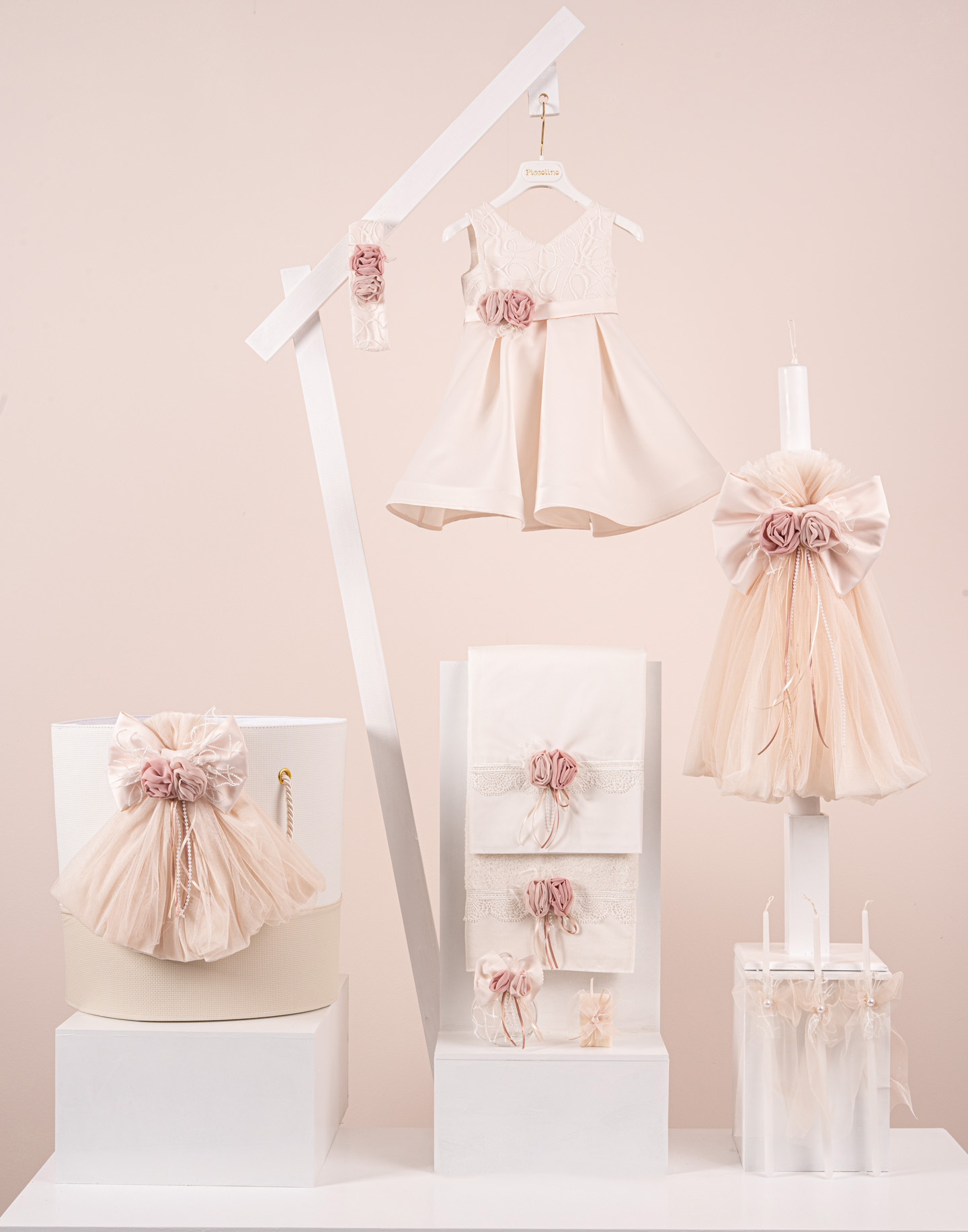 Βαπτιστικό πακέτο Piccolino Carolina champagne περιλαμβάνει φόρεμα ,σετ λαδόπανα, λαμπάδα, λαδοσετ και στολισμένο καλάθι δερμάτινο