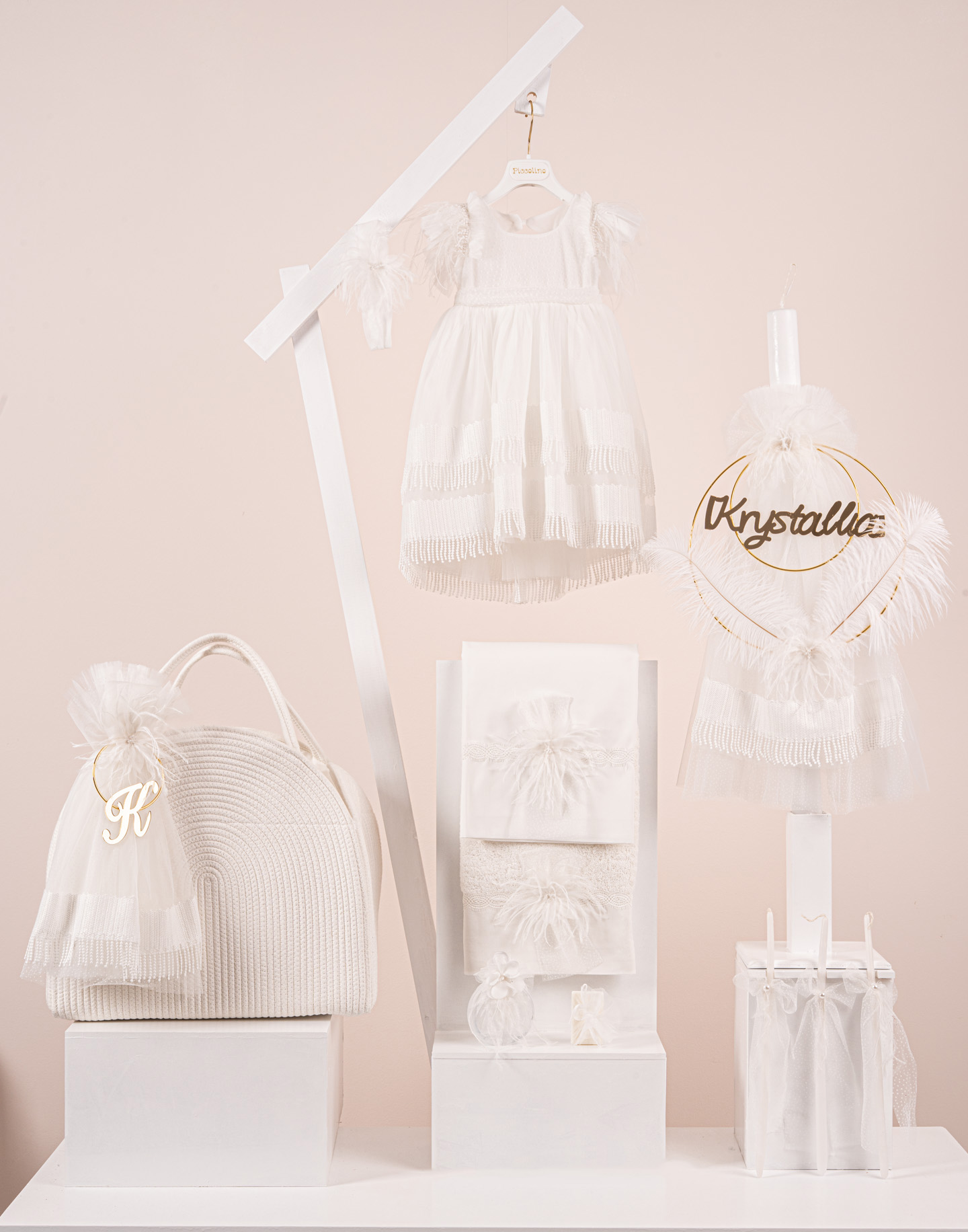 Βαπτιστικό πακέτο Piccolino Catalina ivory περιλαμβάνει φόρεμα ,σετ λαδόπανα, λαμπάδα, λαδοσετ και στολισμένη τσάντα ropes