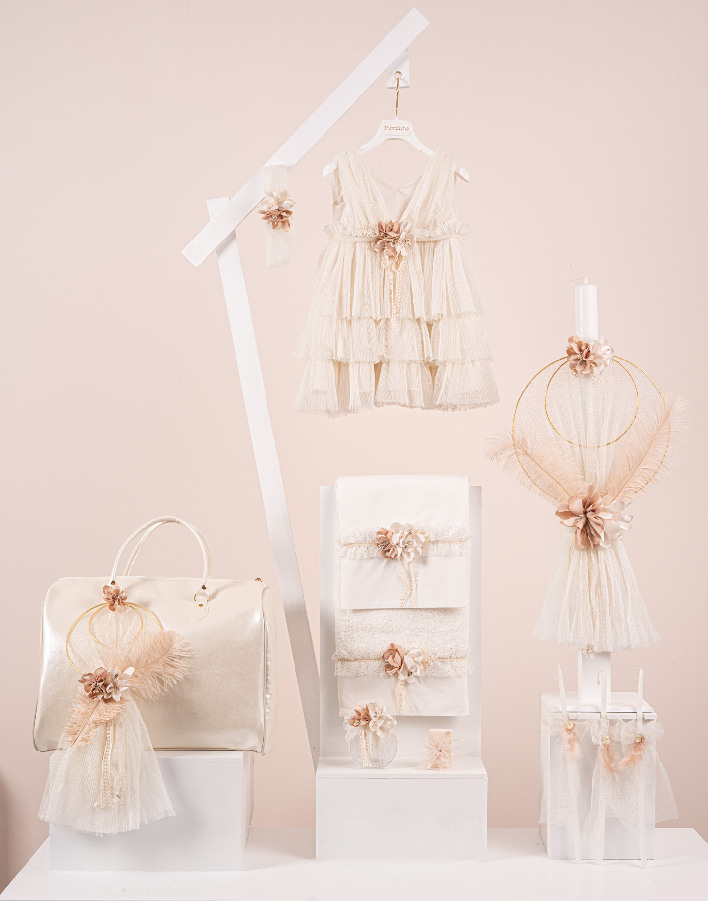 Βαπτιστικό πακέτο Piccolino Eleanor gold περιλαμβάνει φόρεμα ,σετ λαδόπανα, λαμπάδα, λαδοσετ και στολισμένη τσάντα