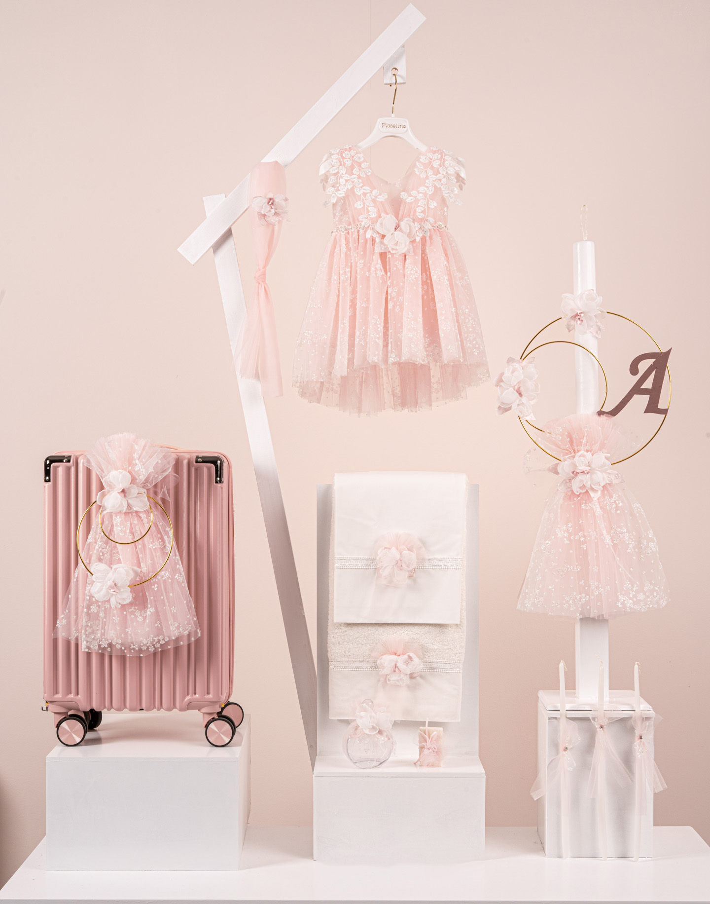 Βαπτιστικό πακέτο Piccolino Filomena pink περιλαμβάνει φόρεμα ,σετ λαδόπανα, λαμπάδα, λαδοσετ και στολισμένη βαλίτσα pink