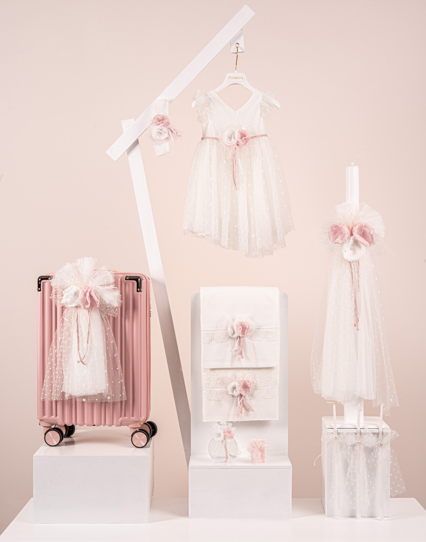 Βαπτιστικό πακέτο Piccolino Ines ivory περιλαμβάνει φόρεμα ,σετ λαδόπανα, λαμπάδα, λαδοσετ και στολισμένη βαλίτσα pink