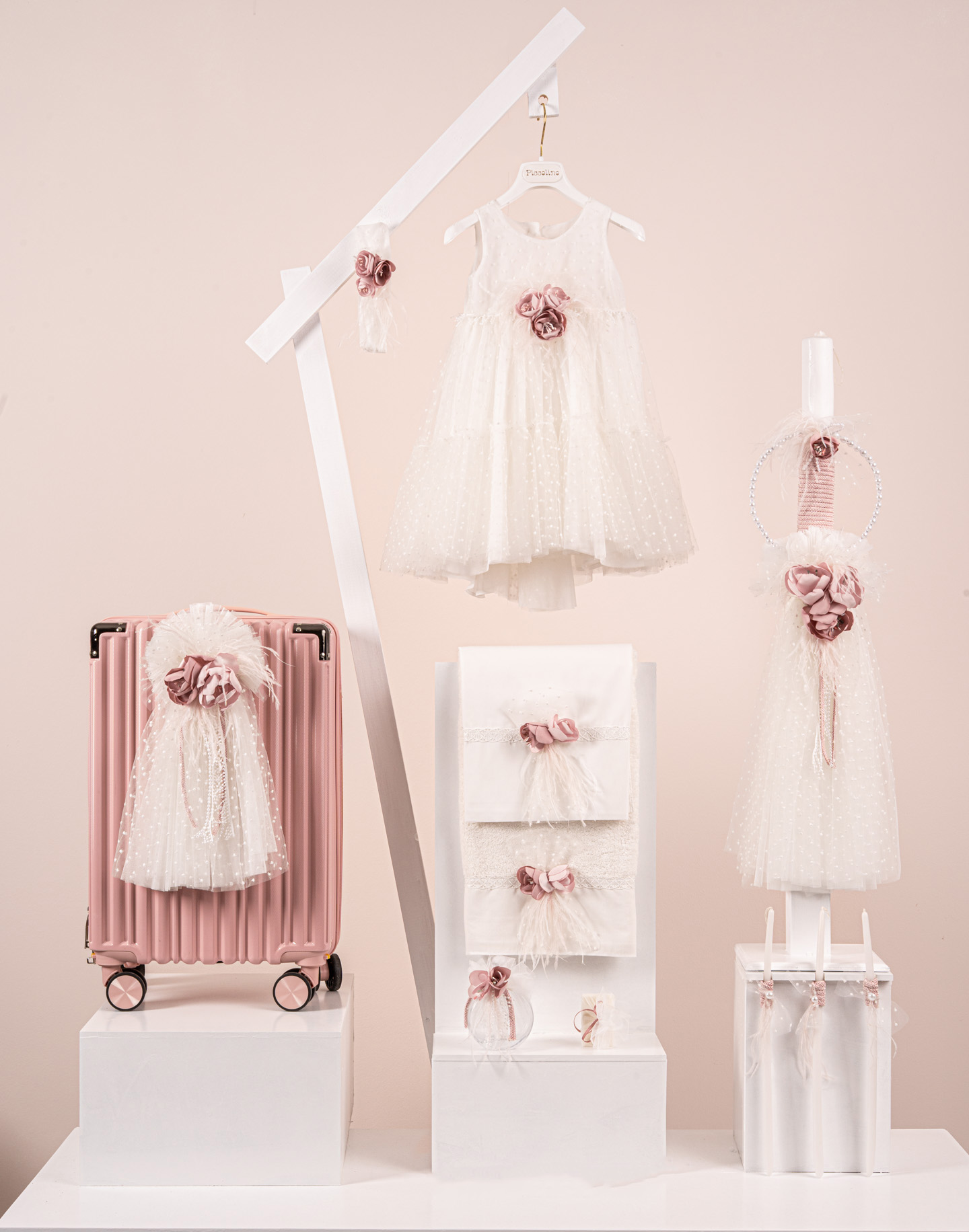 Βαπτιστικό πακέτο Piccolino Luna ivory περιλαμβάνει φόρεμα ,σετ λαδόπανα, λαμπάδα, λαδοσετ και στολισμένη βαλίτσα pink